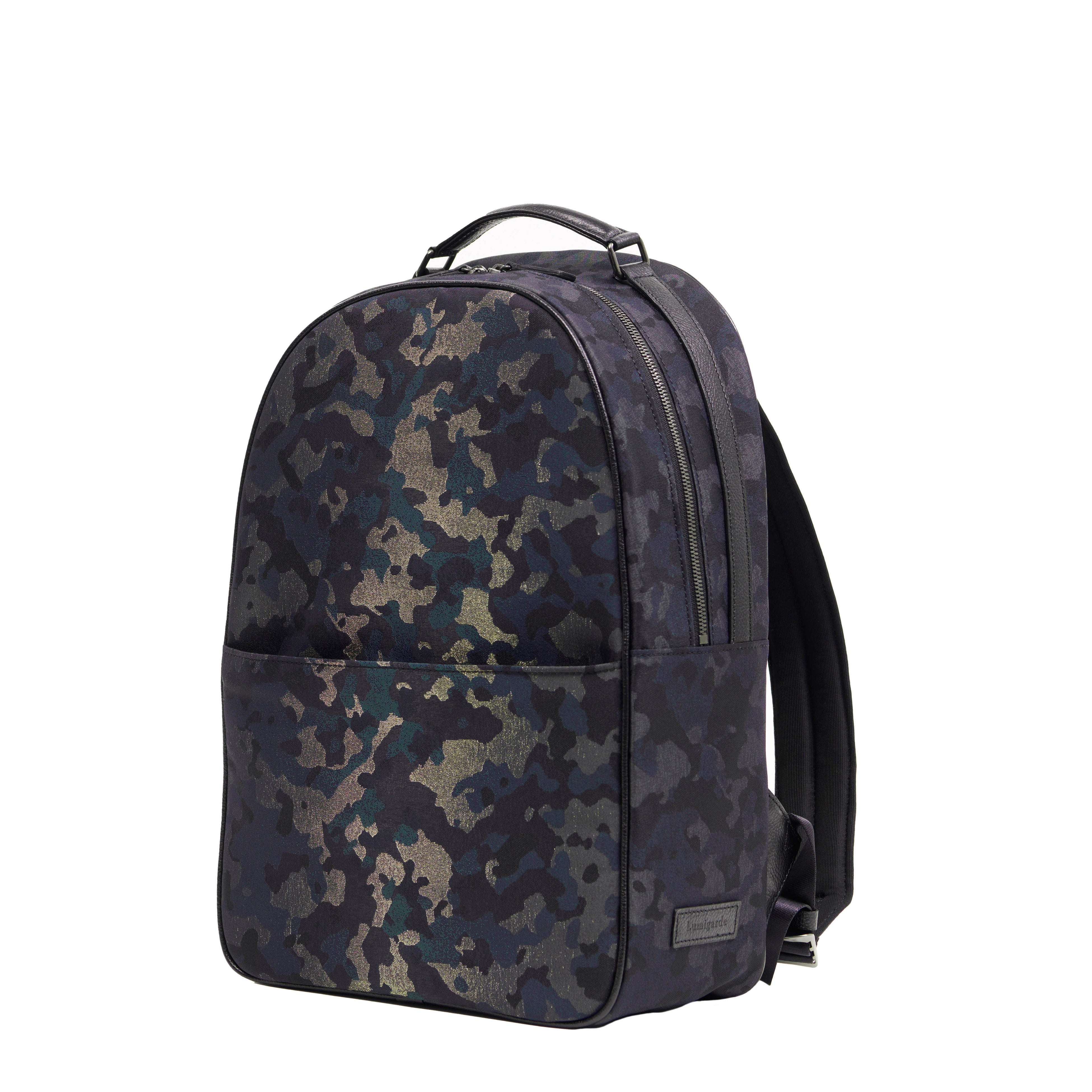 カジュアルな印象のカモフラージュ柄をシーンに溶け込む落ち着いたグリーンと金・銀の糸で表現することで上品なミリタリーに
