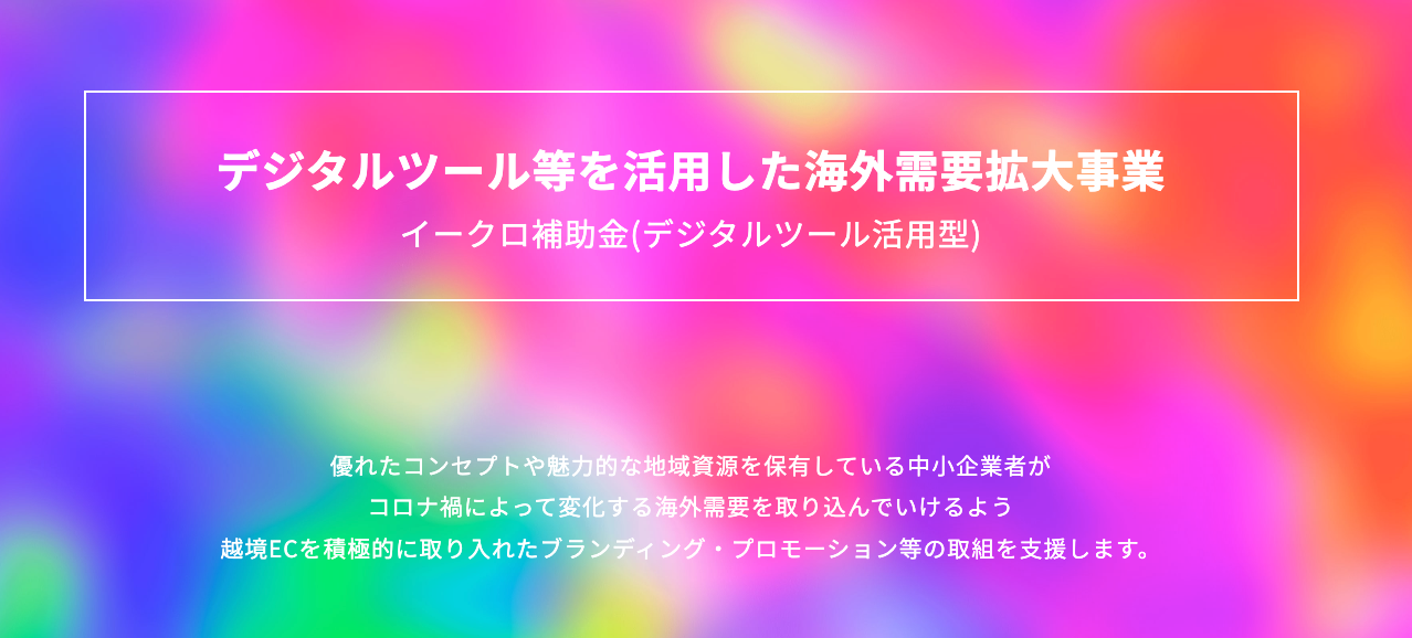 本事業は、本年9月下旬の交付決定から令和5年1月31日までを期間とし、海外展開を目指し、越境 EC を積極的に取り⼊れたブランディング・プロモーション等の取組を行う中小企業様を対象に、その経費の⼀部を補助する事業です。