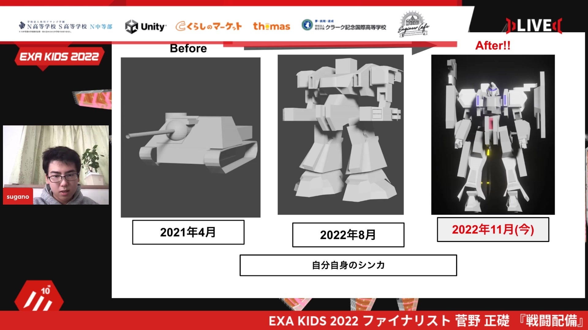 菅野さんはオリジナルのロボットや格納庫をBlenderで再現してくれました。プレゼンの中では制作当初からの自身の作品を比較し、どのように「シンカ」したかを説明してくれました。技巧もさることながら、分析力も見事です。