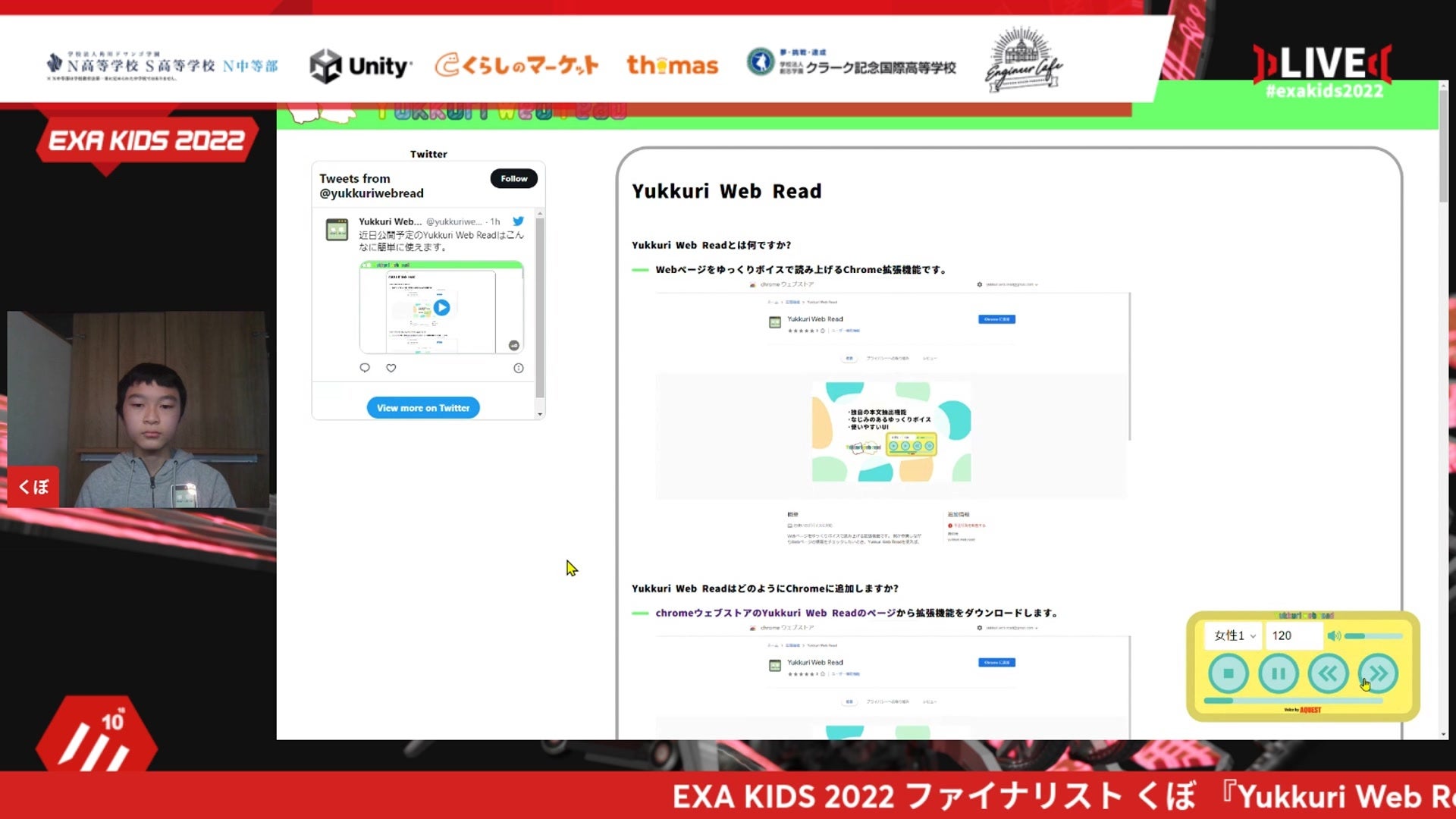 くぼさんが制作したのは、聞きなじみのあるゆっくりボイスでWEBサイトを読み上げる作品。Chromeの拡張機能にすることで、使用する側のハードルを下げるという手軽さを目指しました。知らない単語を読み上げるために使用したりと、学習にも役立ちます。