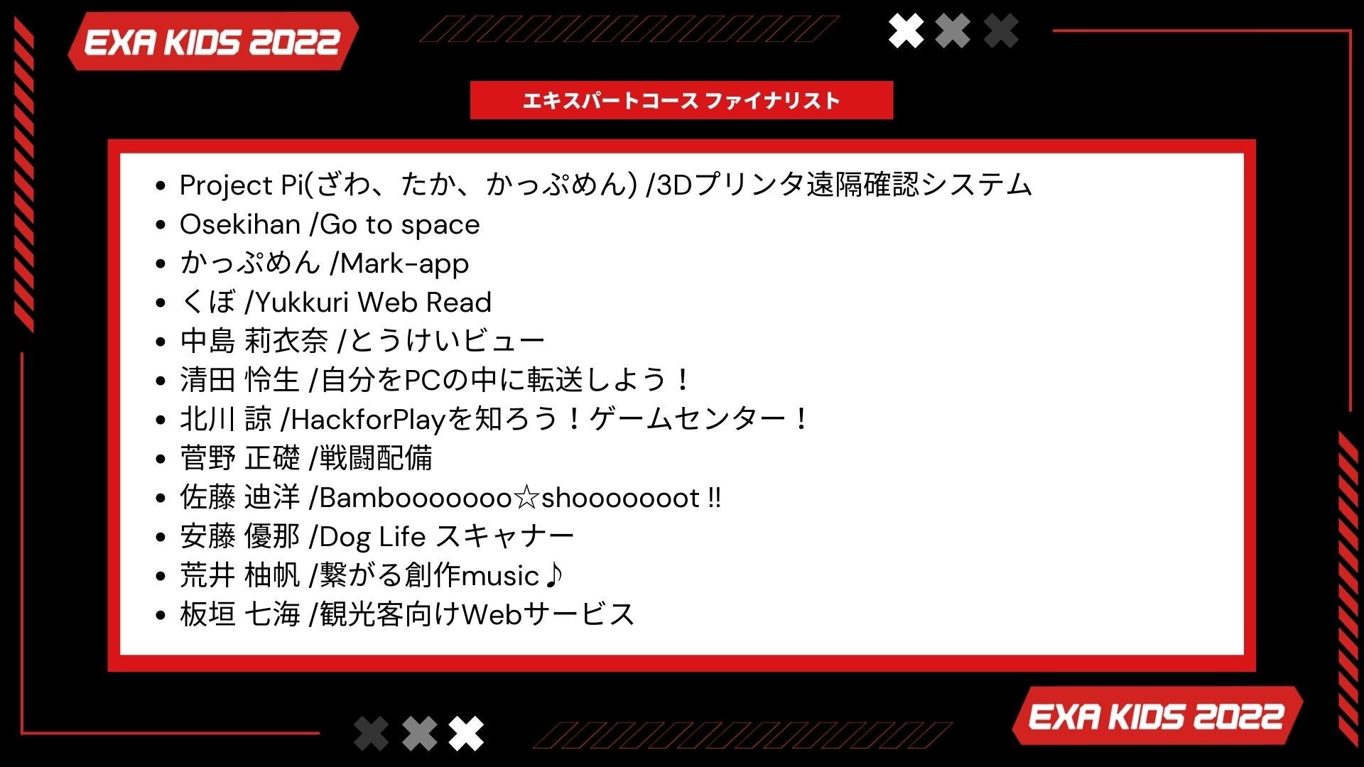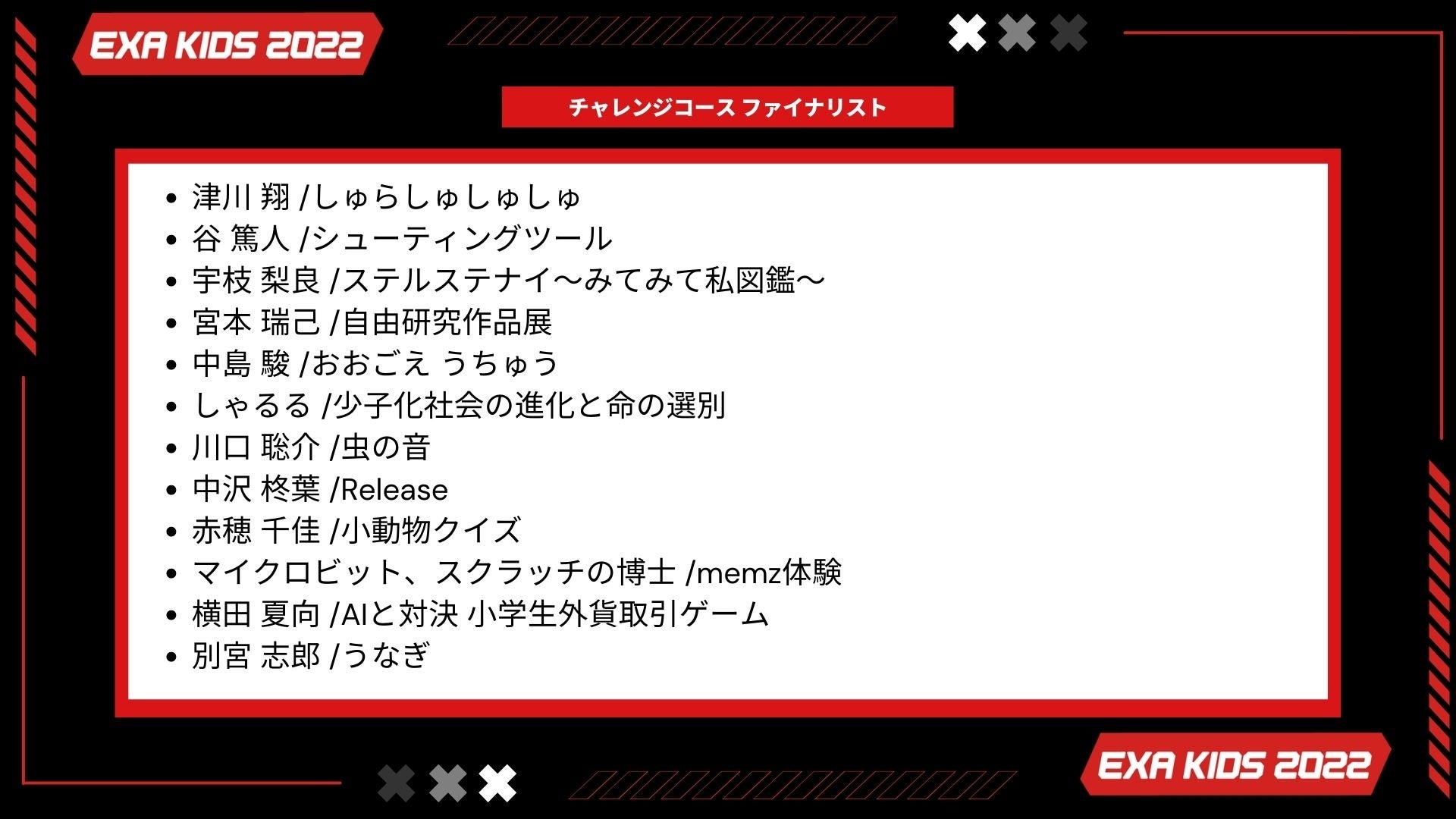 10/15,16に開催された一次審査会、そして11/27に開催されたEXA KIDS 2022を勝ち抜いたのは、中沢柊葉さん(チャレンジコース最優秀賞)とかっぷめんさん(エキスパートコース最優秀賞)です。