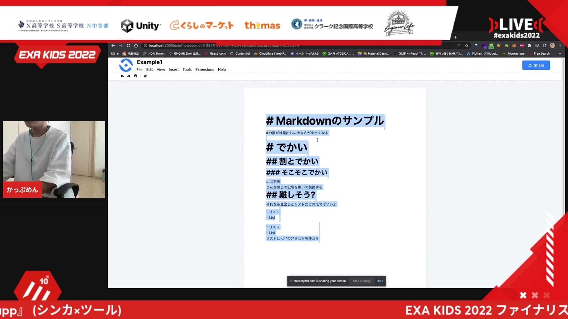 かっぷめんさんがこの作品を作った理由は、通常のMarkdownエディタは無駄な機能が多く使いにくいという経験がきっかけ。実際にリアルタイムで実演しながらその使いやすさを示してくれました。既存のプロダクトよりも、自分が本当に欲しいツールを自分で作ってしまいました!