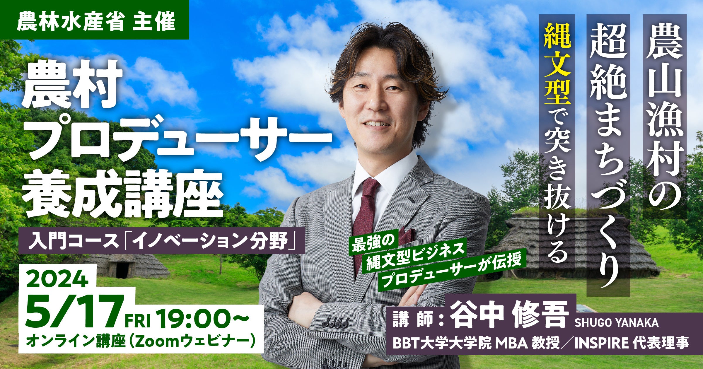 日本全国の地方創生まちづくりで活躍するイノベーター1万人のコミュニティに基づいて体系化した「超絶まちづくり®」の集合知を解説するとともに、農村イノベーションに向けた実践的なノウハウを共有する予定です。また、ロングセラーとなっている著書『最強の縄文型ビジネス』のエッセンスも取り上げるため、縄文にご関心のある皆様にもお楽しみいただけます。入門コースの公開講座として、当該テーマに関心のある方であれば誰でも参加可能です。