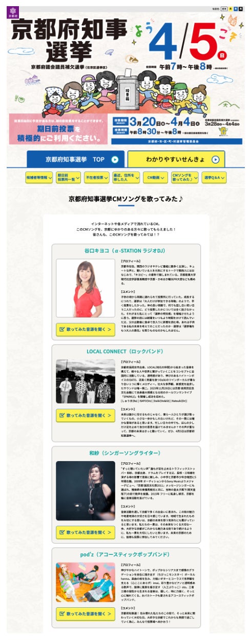 【京都府】 4月5日(日)は京都府知事選挙の投票日! ラジオDJ:谷口キヨコ氏ほか京都ゆかりのアーティスト計4組が「京都府知事選挙CMソング」を歌ってみた♪ ぜひ特設HPやラジオで聞いてみてください