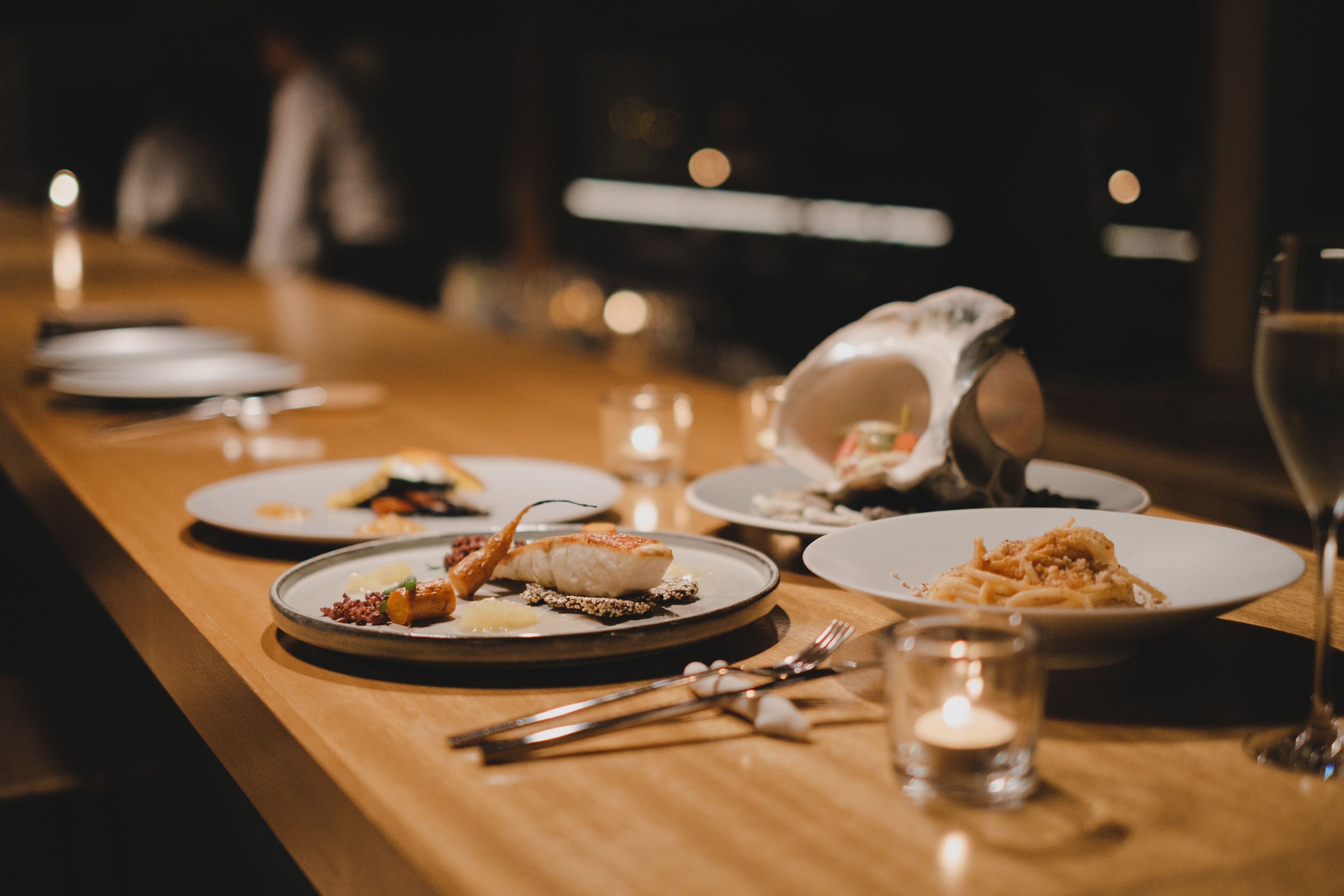 宿に併設するレストラン「2 waters」で、このプラン限定のコース料理を提供します。身体に変化が起きやすいといわれる満月の日だからこそ、身体を引き締める陰性の島の食材を中心に栄養バランスを整えた、4品のコース。オーシャンビューのカウンター席で沈みゆく夕陽を眺めながら、身体の内から整える時間を。