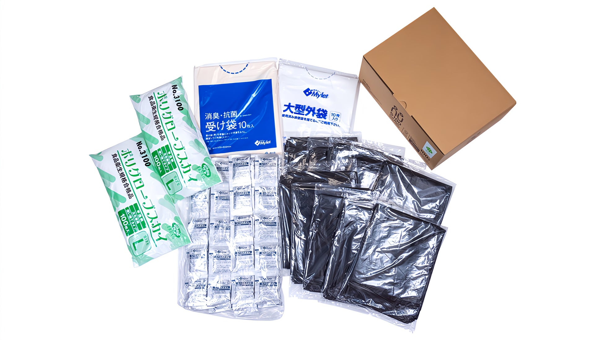 内容物: 抗菌性凝固剤(7g)×100個、大型排便袋(PE製黒)×100枚、大型外袋(PE製白)×10枚、消臭・抗菌受け袋(PE製黄)×10枚、使い捨て手袋(PE製白)×200枚