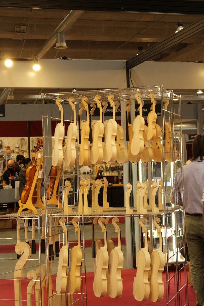 さまざまな製作家が製作した楽器が⼀挙に展⽰される「モンドムジカ」展では、材料となる木材の販売ブーズも多数出展され、製作家たちが自ら材を吟味している姿も見受けられました。