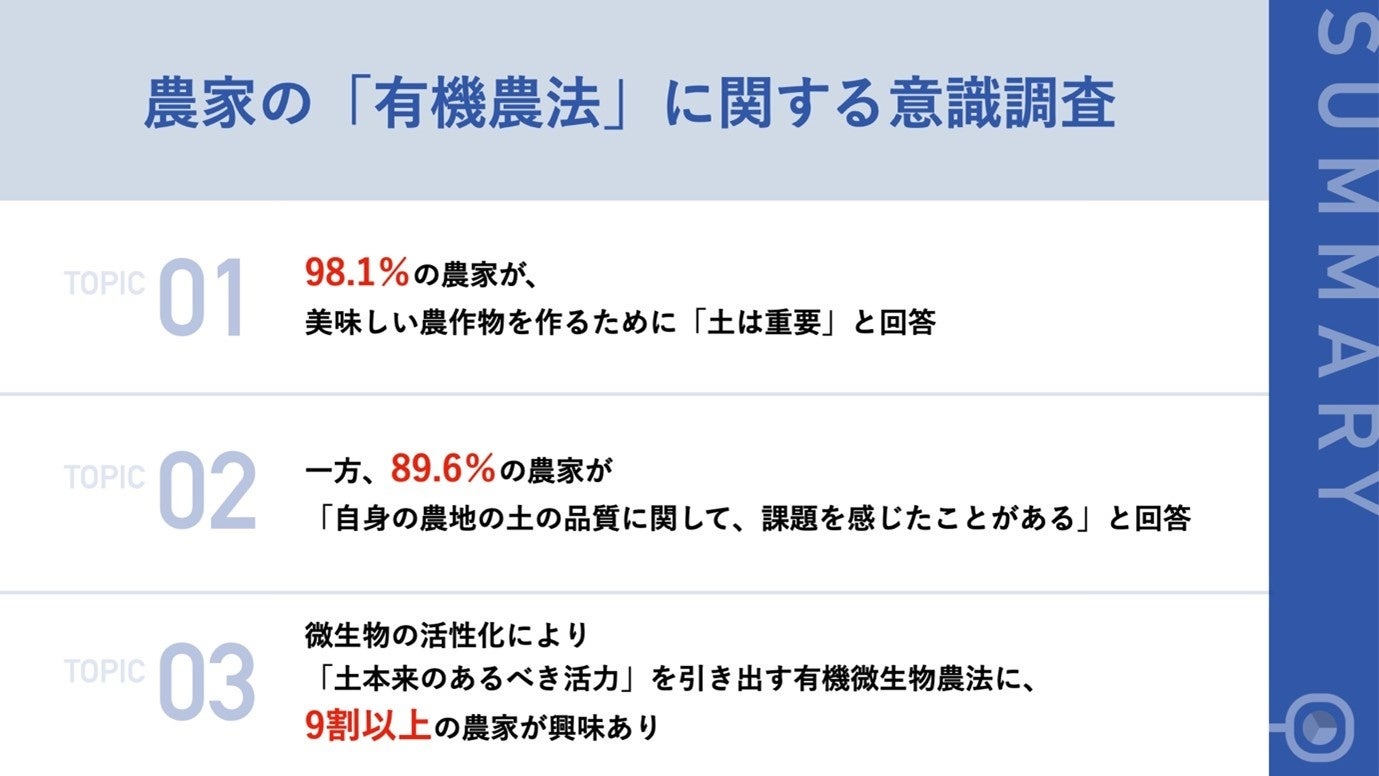 本調査では、ほぼ全ての農家さまが、『美味しい農作物を作るために、「土」が重要』だと認識しており、土壌品質が農作物品質に大きく影響・作用していることが農家さまの回答より判明いたしました。大切なのは、ほぼ全ての農家さまが、土の品質管理に課題を感じており、土の硬さや栄養度合い、排水性など、より良い農作物を作るために格闘している様子が伝わってくる内容となりました。また、9割以上の農家さまが『有機微生物活性農法』について興味を示しており、戦後の農地改革以降、見えない世界として意識されてこなかった微生物がもたらす良い影響に期待が集まり、地球環境へのポジティブな関わりを考慮した農法を模索していることも分かりました。「収穫量の安定」や「生産コスト」という課題をクリアしながら、「土が本来の持つ健康活力」を微生物活性により引き出し、地球の未来を整える「安心・安全」な農法が広く普及されることに時代の注目が集まっています。
