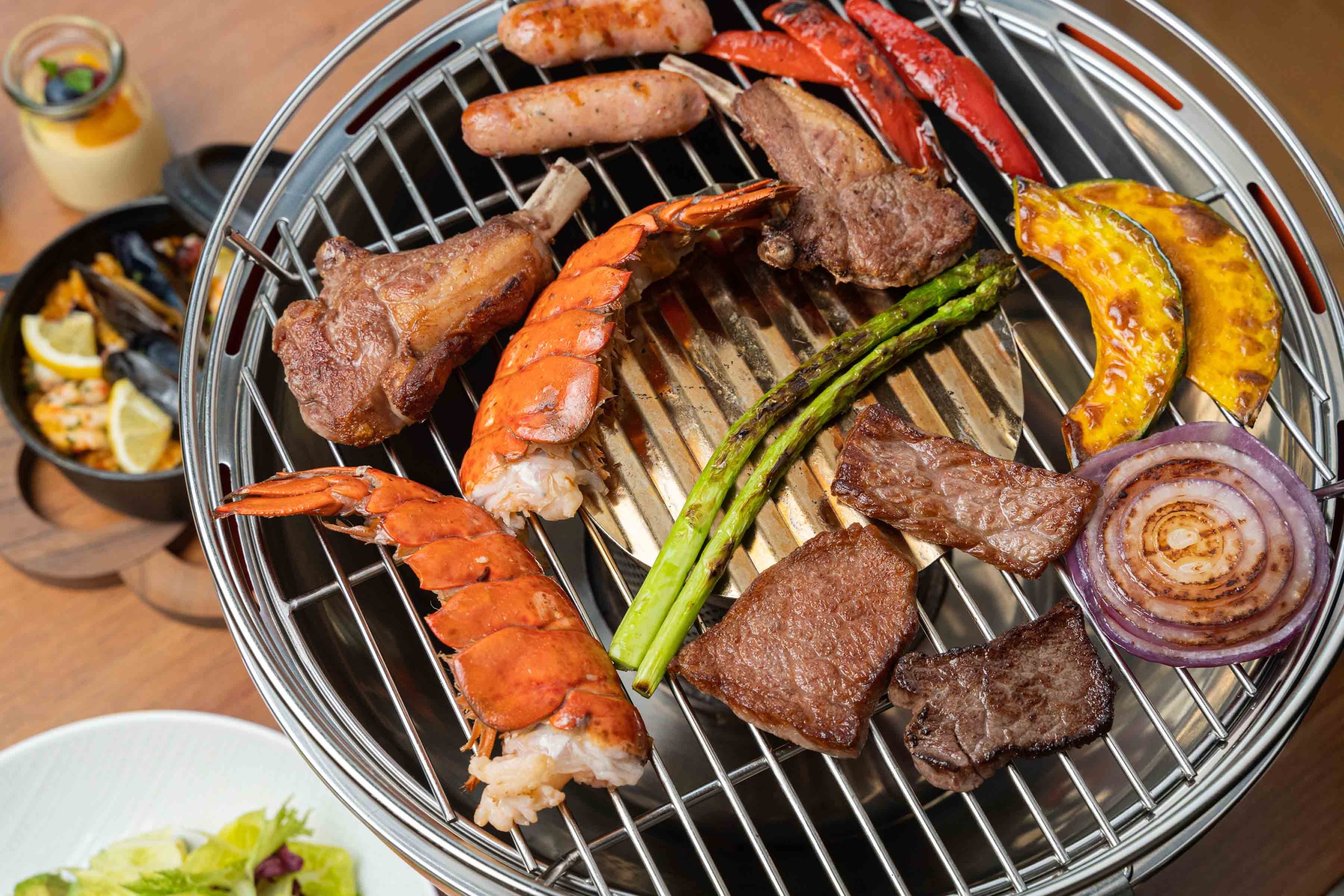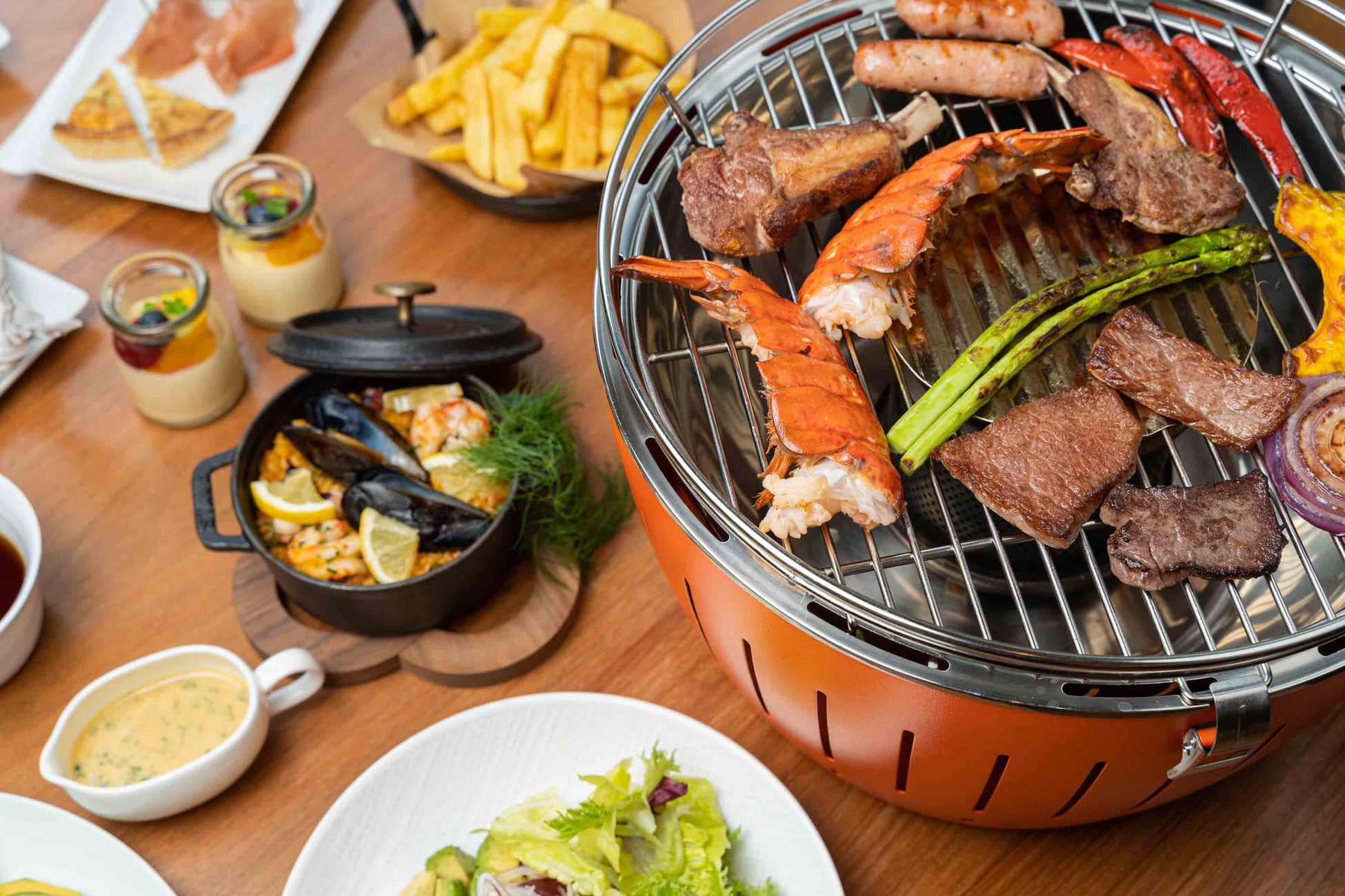 『Garden BBQ』では、バーベキューの醍醐味である緑豊かな自然に囲まれた開放感と、ホテルならではの食体験を堪能いただけます。レストラン「ダイニングルーム-ウェスタンキュイジーヌ」が提供する食材のクオリティはそのままに、バーベキューにはめずらしい“ロブスター”や“黒毛和牛”などの厳選食材をはじめ、ロブスターの出汁で作ったシーフードパエリア、夏の旬野菜などが並びます。各テーブルに設置する炭火グリルの卓上コンロでご自身で調理していただくスタイルでお楽しみください。