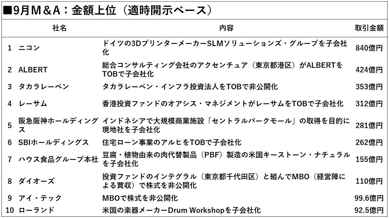 金額首位はニコンが約840億円を投じて3Ⅾ(3次元)プリンターのドイツ企業を買収する案件。2位以下はTOB(株式公開買い付け)案件が並び、6件を占めました。