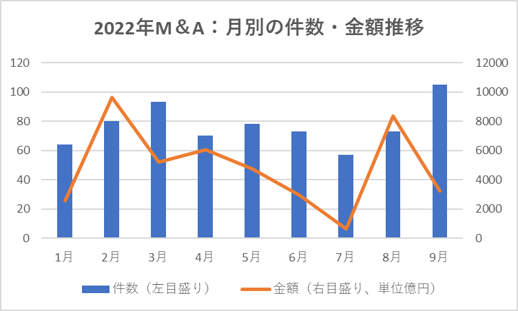 M&Aの件数は、通常年度末の3月がピークとなる。今年9月は、年度上半期末とはいえ3月(93件)を上回るのは異例といえる。ウクライナ危機による地政学リスクの高まり、急速な円安、慢性的な半導体不足などに直面しながらも、新型コロナ感染の落ち着きを背景に経済活動の正常化を反映した動きとみられる。