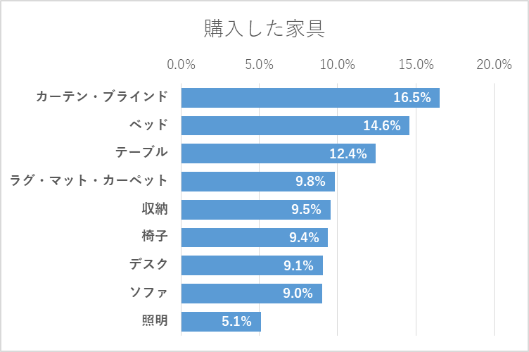 購入した家具1位は16.5%で「カーテン・ブラインド」、2位は14.6%で「ベッド」、3位は12.4%で「テーブル」という結果になりました。