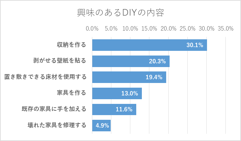 「収納を作る」が1番多く30.1%、次いで「剥がせる壁紙を貼る」20.3%、「置き敷きできる床材を使用する」19.4%でした。