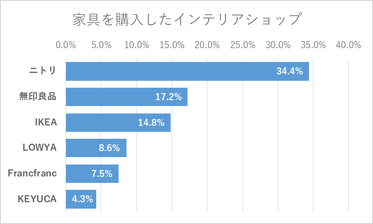 1位は「ニトリ」(34.4%)、2位は「無印良品」(17.2%)、3位は「IKEA」(14.8%)でした。多店舗展開しており、シンプルなデザインで比較的手の届きやすい価格で購入できるブランドが人気のようです。