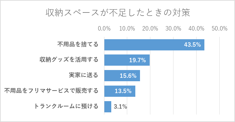 収納スペースが不足したときの対策として、最も多くの方が回答したのは「不用品を捨てる」(43.5%)でした。一人暮らしでは収納場所を増やそうとしても思うように増やせず、モノが溢れるたびに不用品を処分している方が多いのかもしれません。