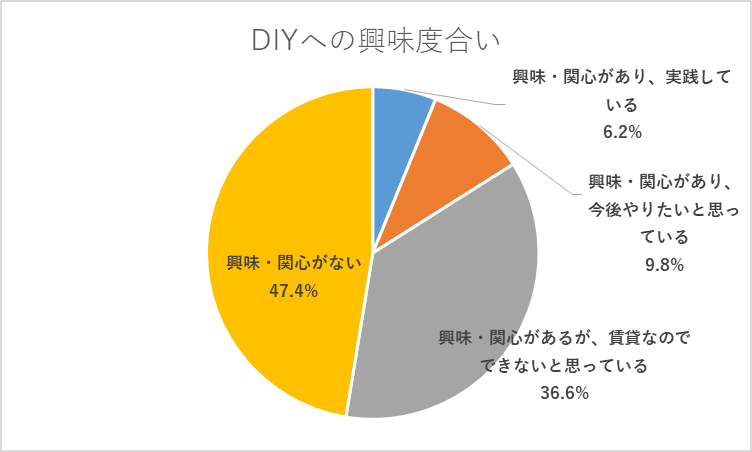 DIYなら自分好みのインテリアを実現できるため、部屋全体のテイストに統一感を出すことが可能です。しかし、DIYを「実践している」人は6.2%しかおらず、「賃貸なのでできないと思っている」人が36.6%もいるようです。