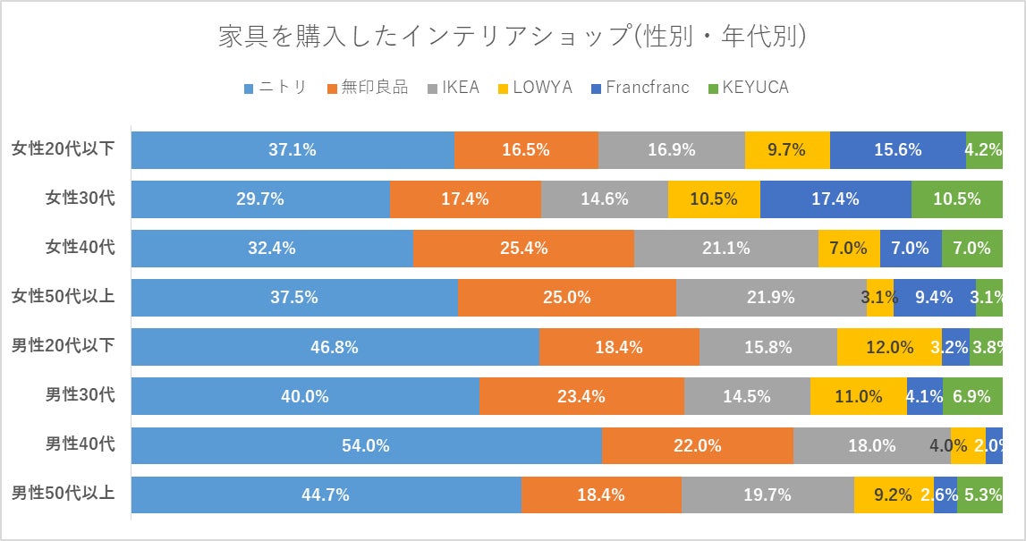 また、「LOWYA」「Francfranc」は30代以下の女性を中心に人気を集めており、30代女性は「Francfranc」で購入した方の割合が「無印良品」と並んで2番目に多い結果となりました。