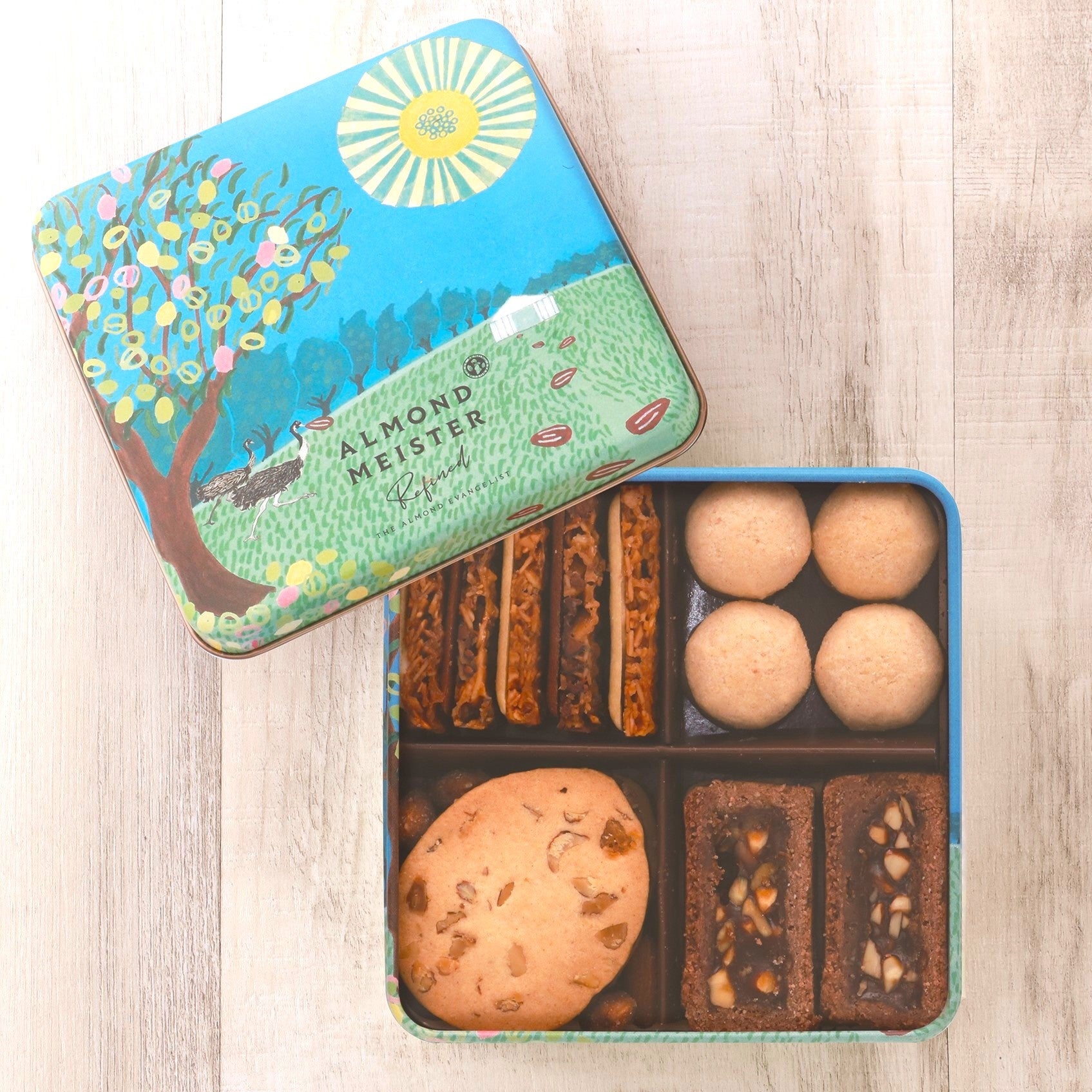 バレンタイン・ホワイトデーに大人気!アーモンド尽くしの可愛いクッキー缶が、中身・デザインともにリニューアル。アーモンドの多様な魅力を引き出した、バラエティ豊かな6種類のクッキーと1種類の味付きアーモンドを詰め合わせました。アーモンド農園をイメージした風景を缶いっぱいに描いた、贈り物にぴったりの一品です。