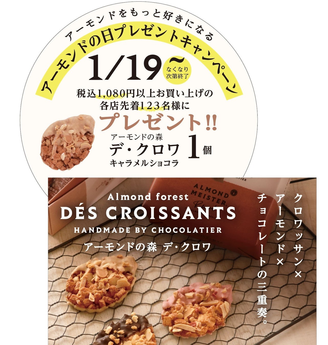 ●特典:1月10日発売の新商品「アーモンドの森 デ・クロワ」を1個プレゼント