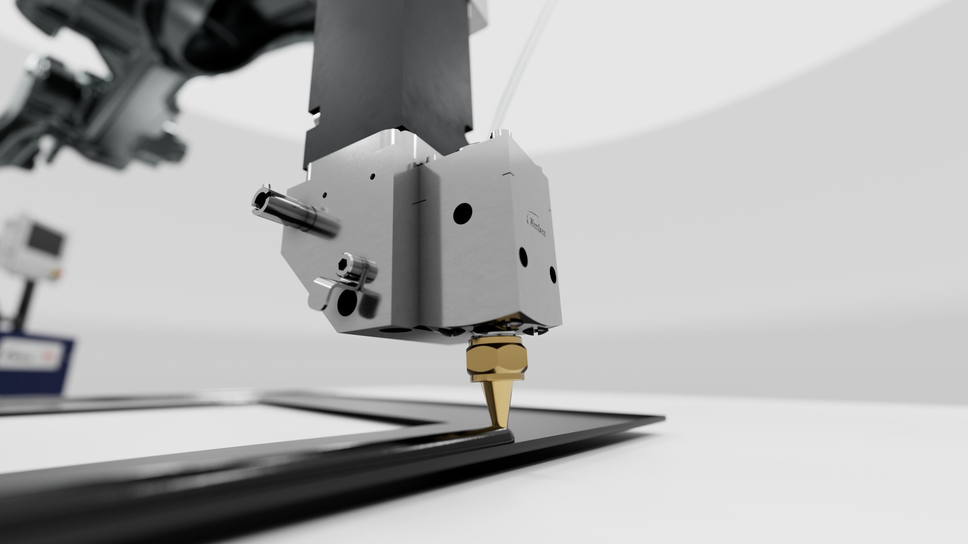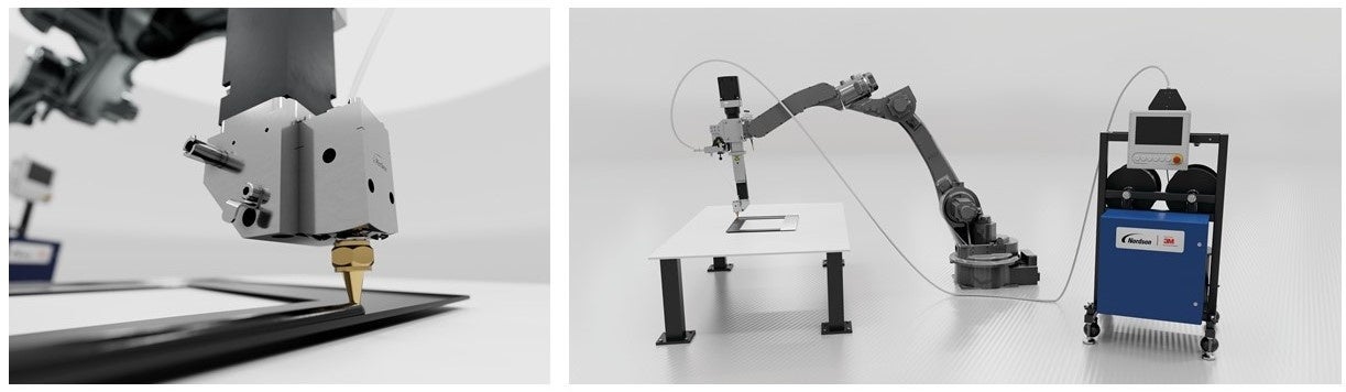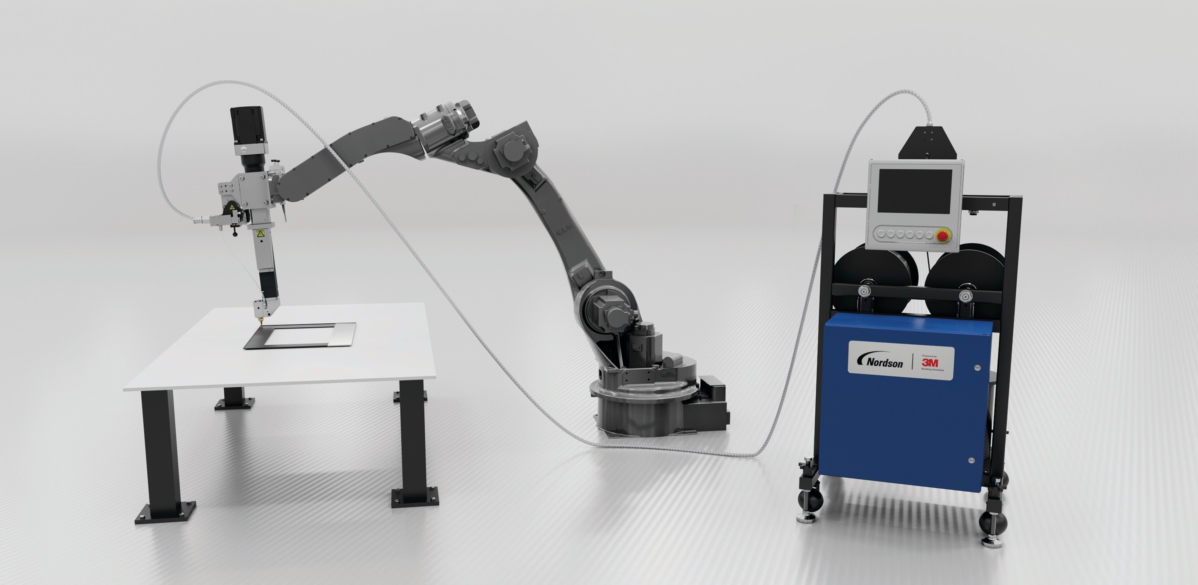 接着・コーティング関連機器のマーケットリーダーであるノードソン社との協業により誕生した「3M™ オンデマンド ボンディング システム」は、「3M™ VHB™ エクストルーダブル テープ」専用に開発されたProBond™ Adhesive systemを使用し塗布します。塗布設備は、Nordson社より販売となります。また、塗布用のアームロボットは、お客様が自由に選択することが可能です。