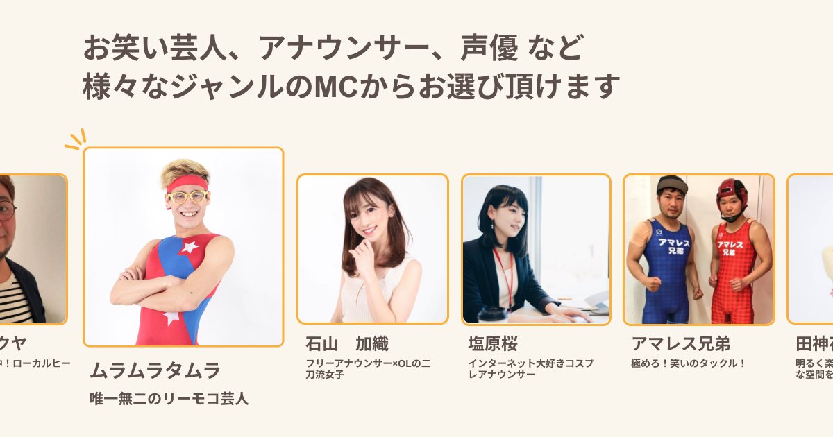- お笑い芸人からアナウンサーまで、幅広い人材からMCを探せる