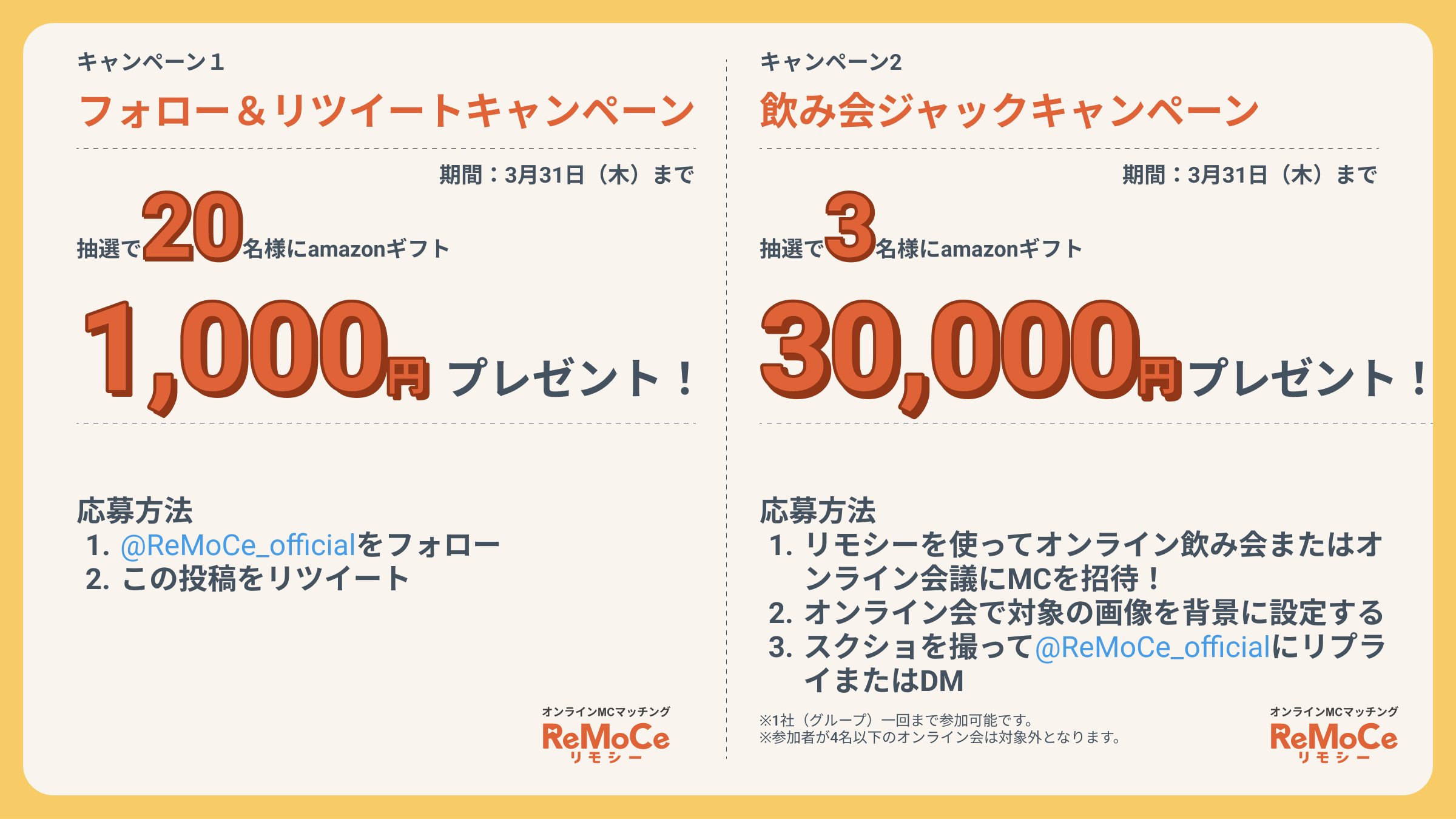 【3万円プレゼント!】オンライン飲み会にお笑い芸人やアナウンサーを呼べるMCマッチングサービス「ReMoCe」好評につき、大型キャンペーン開催決定!