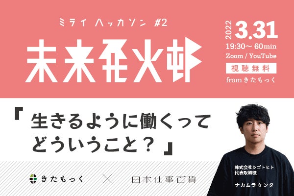 有限会社きたもっく(本社:群馬県北軽井沢、代表:福嶋 誠)は、多様なゲストと共に多分野の未来について語り合うウェビナー「未来発火邨(ミライハッカソン)」を開催します。第2回のゲストは、「日本仕事百貨」を主催するナカムラケンタさん。きたもっくの移住+転職組のリアルな前後談から、ナカムラさんと「働く」の未来について考えます。