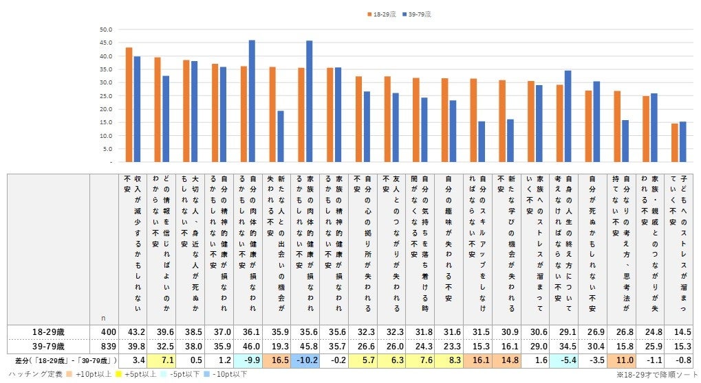 「具体的な不安」に関して、若年層(18-29歳)の3人に1人が「学びの機会が失われる」「新たな人との出会いが失われる」「自身のスキルアップをしなくてはならない」について不安に感じ、他の年齢層より高くなっています。新型コロナ感染拡大による自粛生活や学校の休講などでの経験喪失とあせりが感じられるようです。