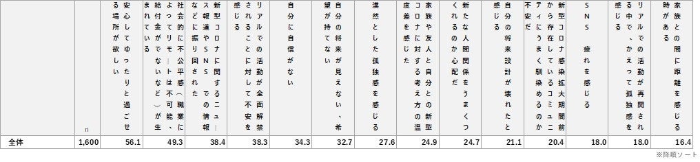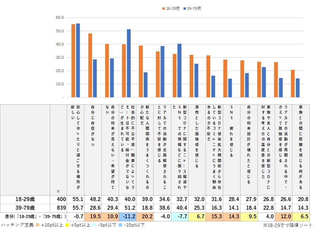新型コロナ感染拡大により、全世代で6割の人が「安心して過ごせる場所が欲しい」と望む。また、以前のような生活に戻ることを考えると、若年層の3人に1人が「新たな人間関係をうまくつくれるのか心配」と回答。