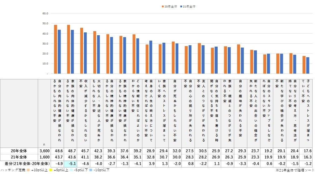 21年では、20年より全体として不安度が平均値で0.7pt減少しています。ワクチン接種率の増加などによる感染者数減少が影響しているとみられます。(表1)