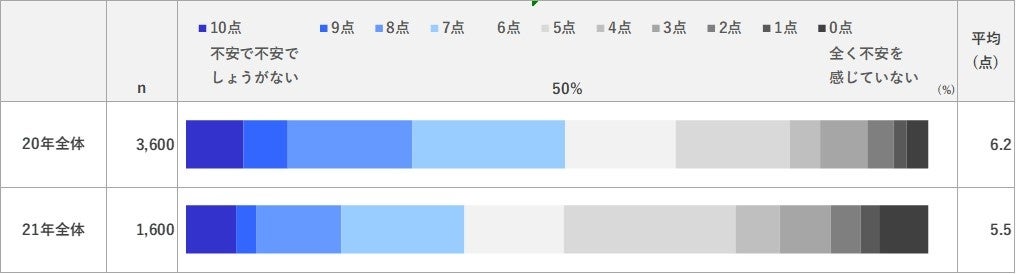 (表1)Q 新型コロナ感染拡大期間をふまえ、これから(~来年いっぱい)のご自身の生活について、どの程度不安を感じますか。「不安で不安でしょうがない」を10点、「全く不安を感じていない」を0点として、最も近いものをお選びください。