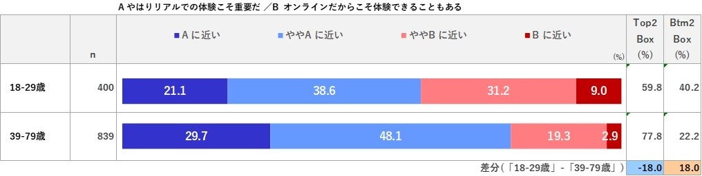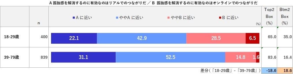 中高年層(39‐79歳)はやはりリアル派が多く、「孤独感の解消法/体験」共に約8割が「リアル」を選択しています。しかし、「リアルでの活動が全面解禁されることに不安」 については中高年層のスコアが高く、あくまでもコミュニケーションの手段としてリアルを大切にしたいことが伺われます。