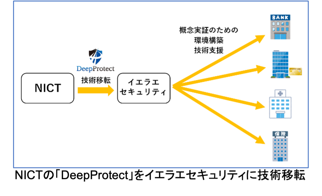 今回NICTは、サイバーセキュリティ・暗号・機械学習に関する高い技術力を持ち、実社会における社会課題解決に先端技術を適用する際のUX/UIデザインに強みを持つイエラエセキュリティとパートナーシップを構築し、同社に対し、「DeepProtect」に関する知的財産権をライセンスし技術移転を行いました。