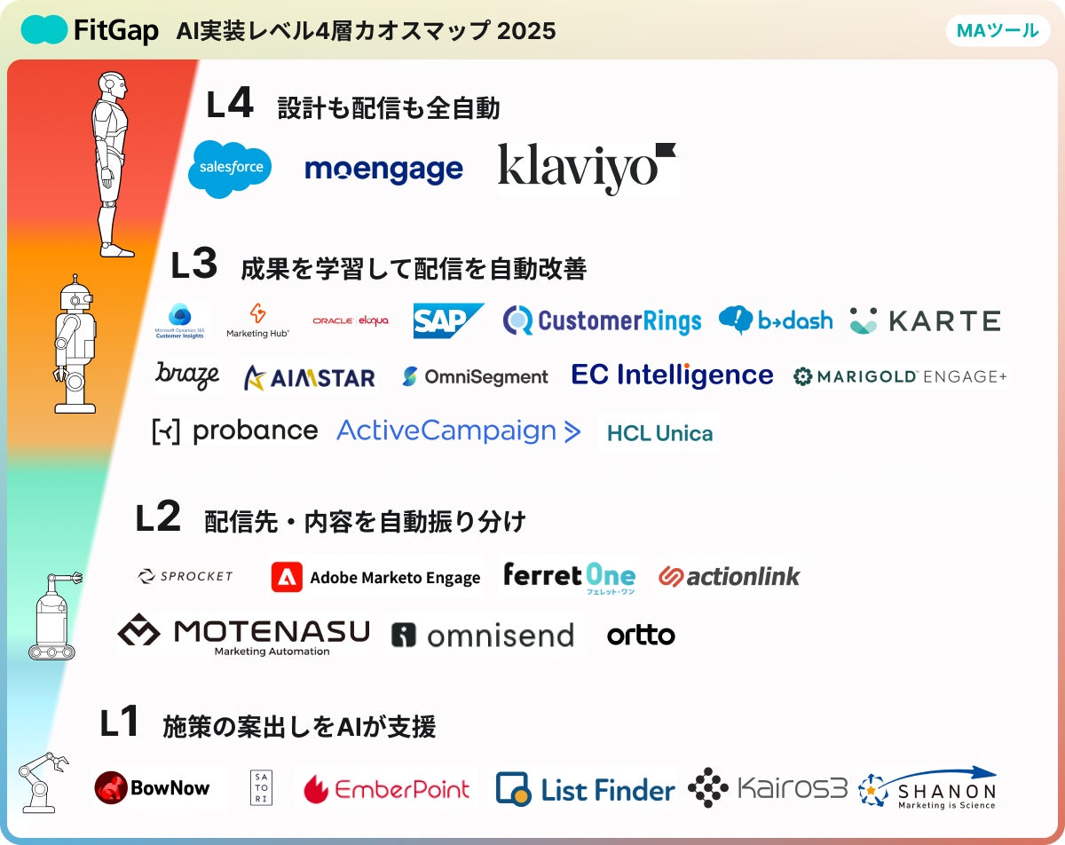 【無料公開】AI実装の段階が一目でわかる ー MAツールのAI実装レベル4層カオスマップ|2025完全版