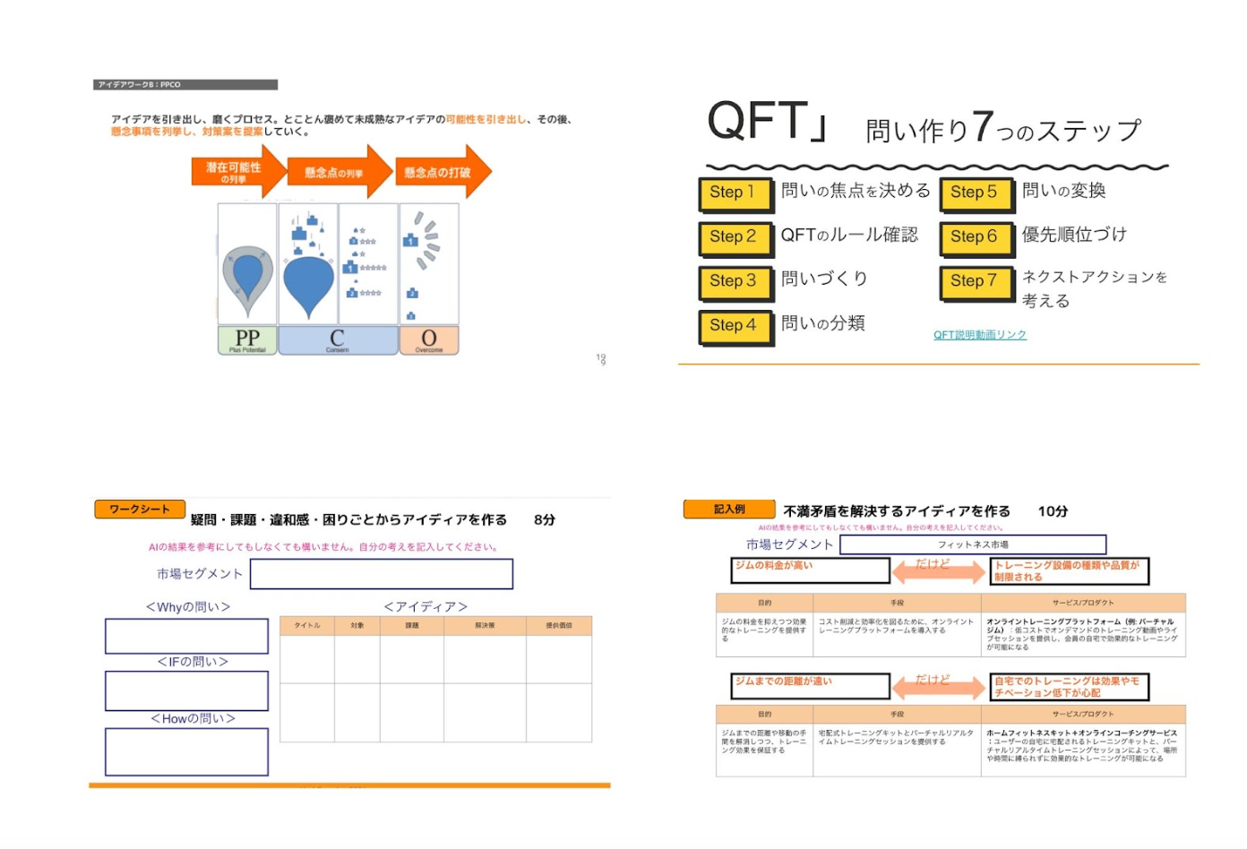 2. 本質的な課題の発見や価値の探索には問う力が重要になります。「何を問うべきか」、「何を知りたいか」を決めるのは意思や感情がある人間にしかできません。疑問や違和感、願望を明らかにするための「問い続ける力」を強化する質問づくりQFTメソッドを利用します。