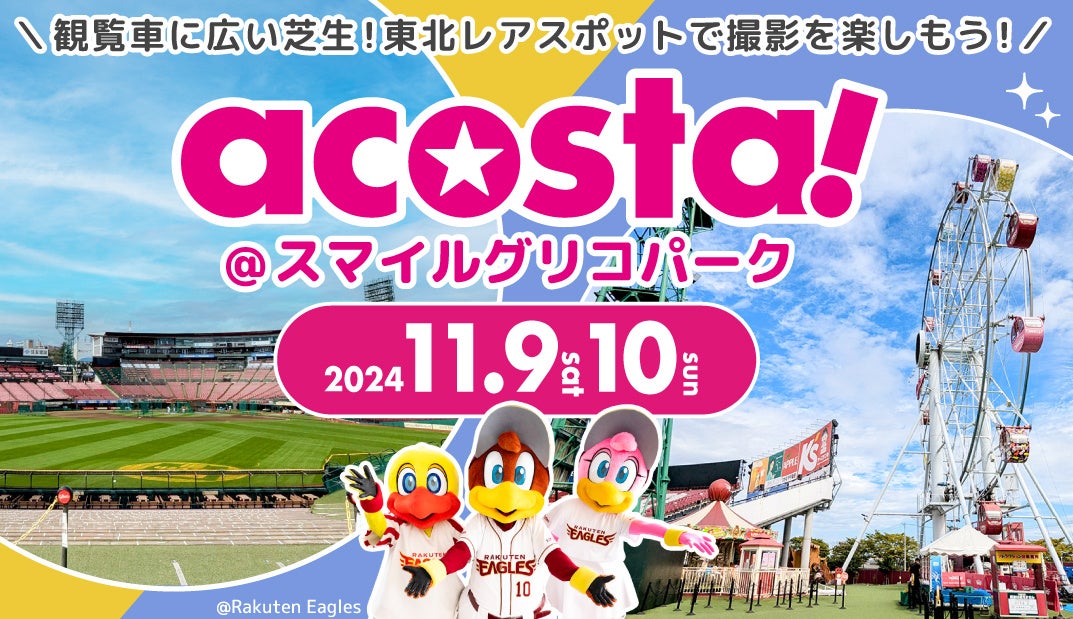 日本全国でコスプレイベントを運営する株式会社ハコスタ(本社:大阪市、代表取締役:松村 良洋)は、2024年11月9日(土)・10日(日)の2日間、「コスプレイベントacosta!(アコスタ)」を日本で唯一スタジアムが見下ろせる観覧車やメリーゴーラウンドなどの施設がある「スマイルグリコパーク」(宮城県仙台市)で初開催します。