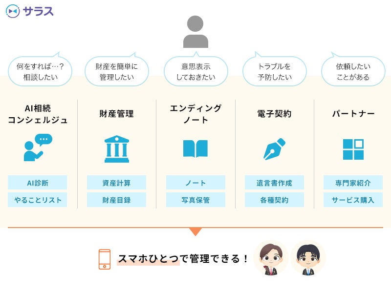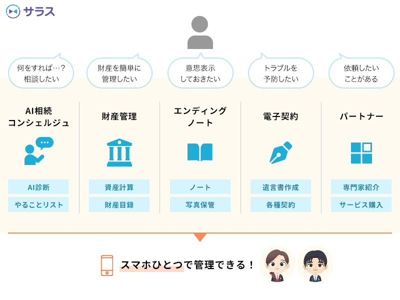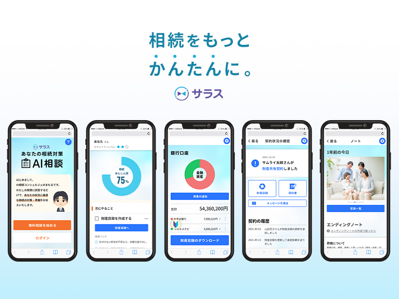 サラスはスマートフォンひとつで相続対策や終活の準備を進めることができるオンライン相続支援サービスです。