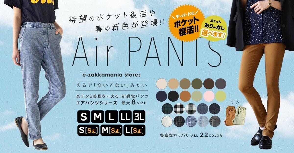 驚くほどに伸びて軽く、とにかく楽に穿けるとリピーターも多いイーザッカマニアストアーズのエアパンツシリーズ。2014年にスキニータイプを発売したところ、瞬く間に大人気商品になり、シリーズ累計販売数は160万本を超えています。