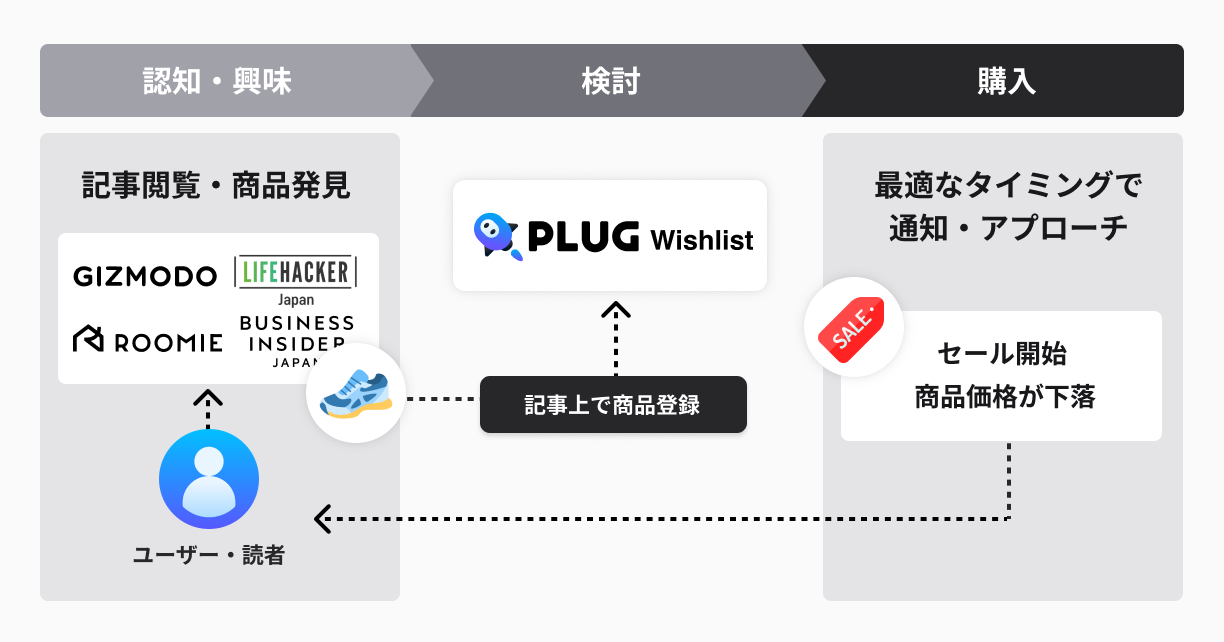 『PLUG Wishlist』はメディア起点でファーストパーティーデータを取得し、ユーザーとの継続的なコミュニケーション、サービス提供を可能とします。