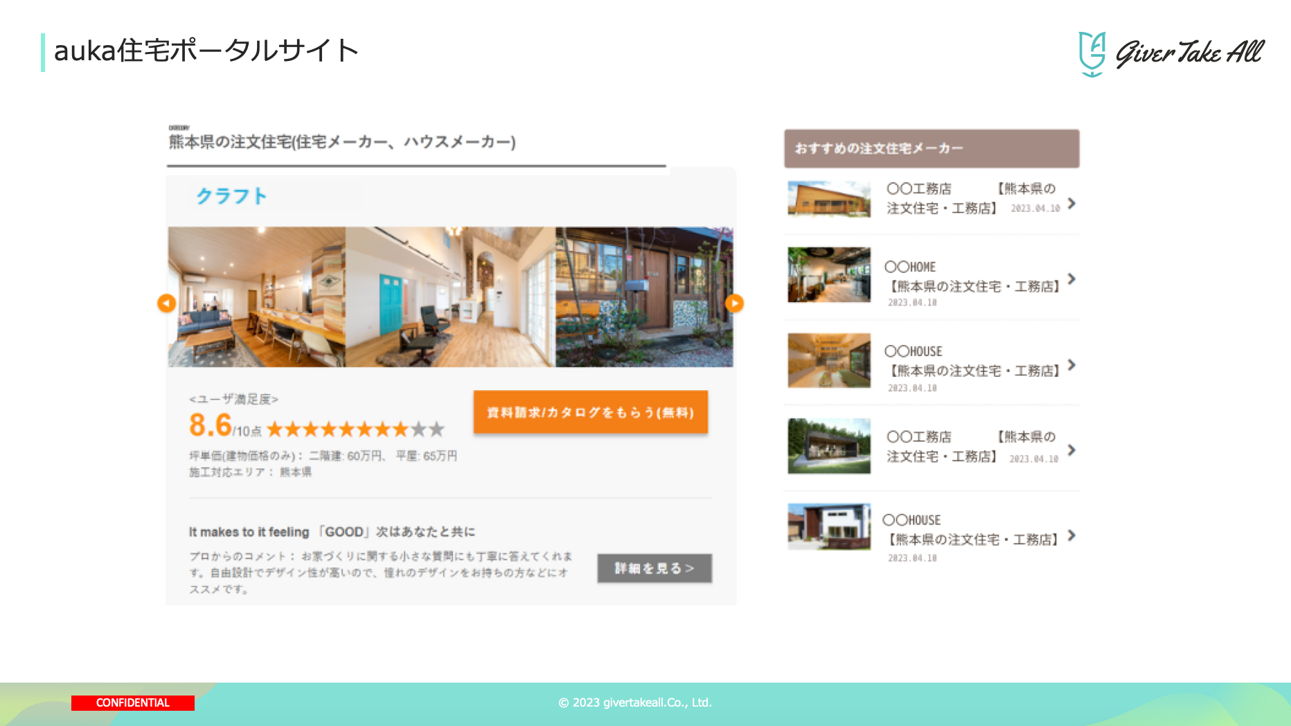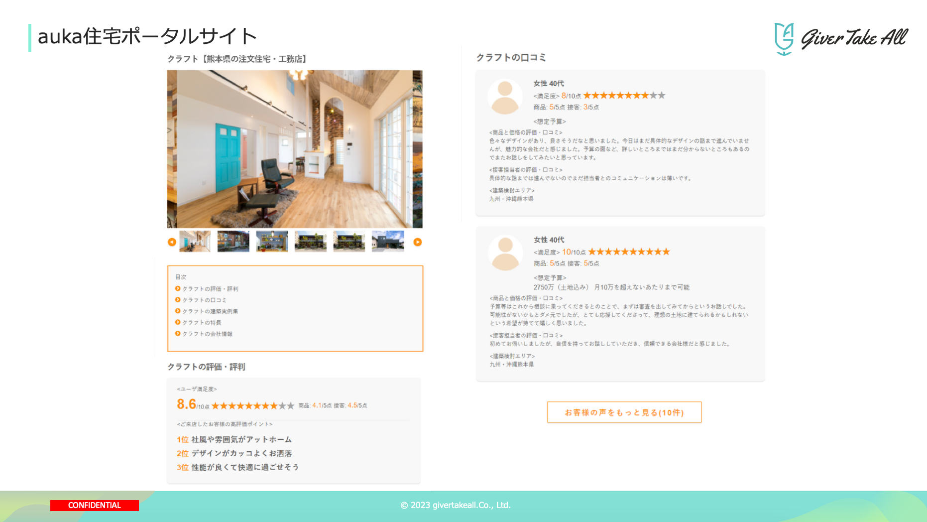 住宅購入を検討するユーザーは、豊富な施工実例写真とあわせて、auka独自の貴重な口コミデータも閲覧できることで、自分の好みに合致した工務店を探しやすくなります。家づくりのイメージや必要な情報がよりスムーズに得られるため、ユーザーの購買意欲の失速防止と向上が期待できます。