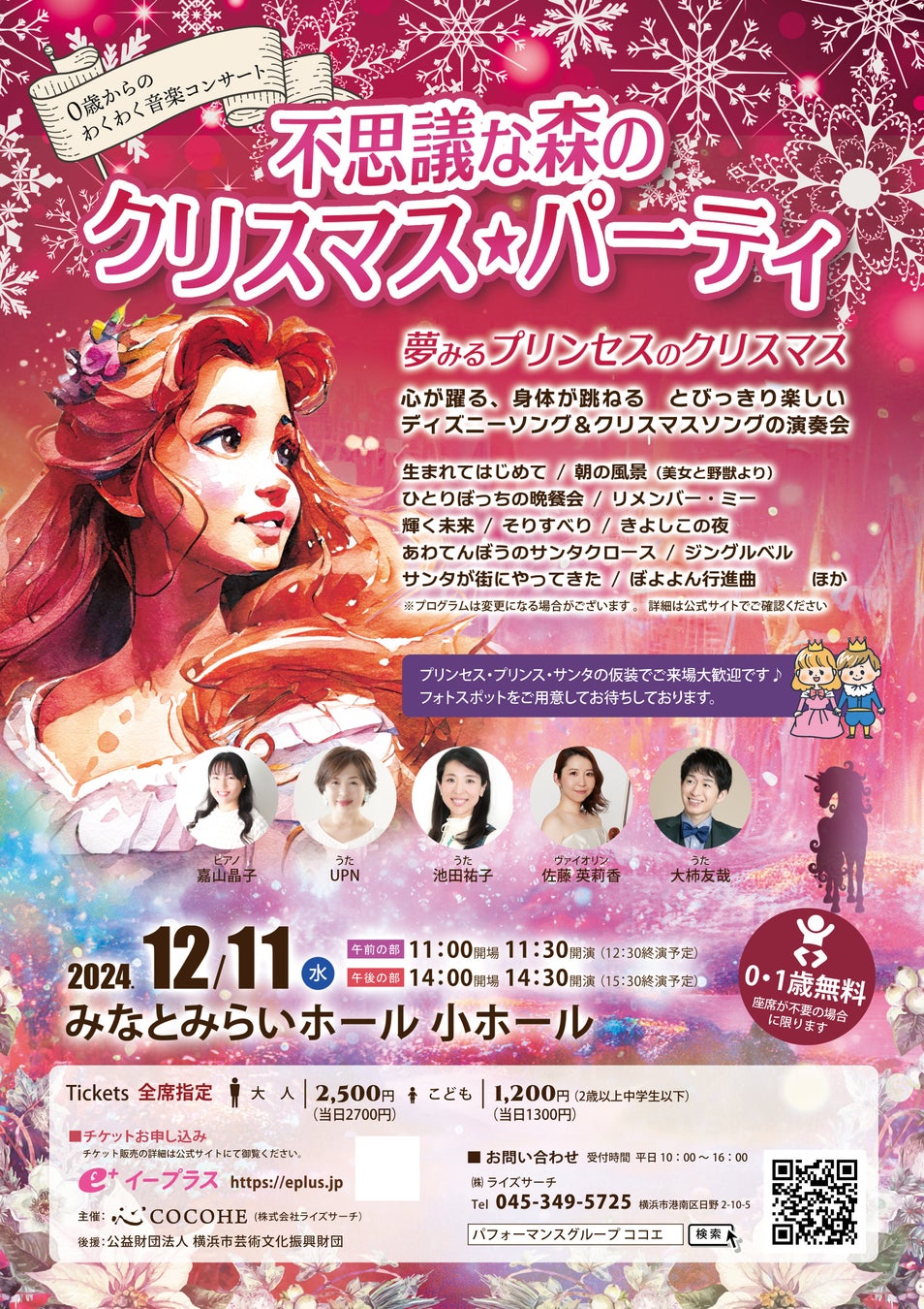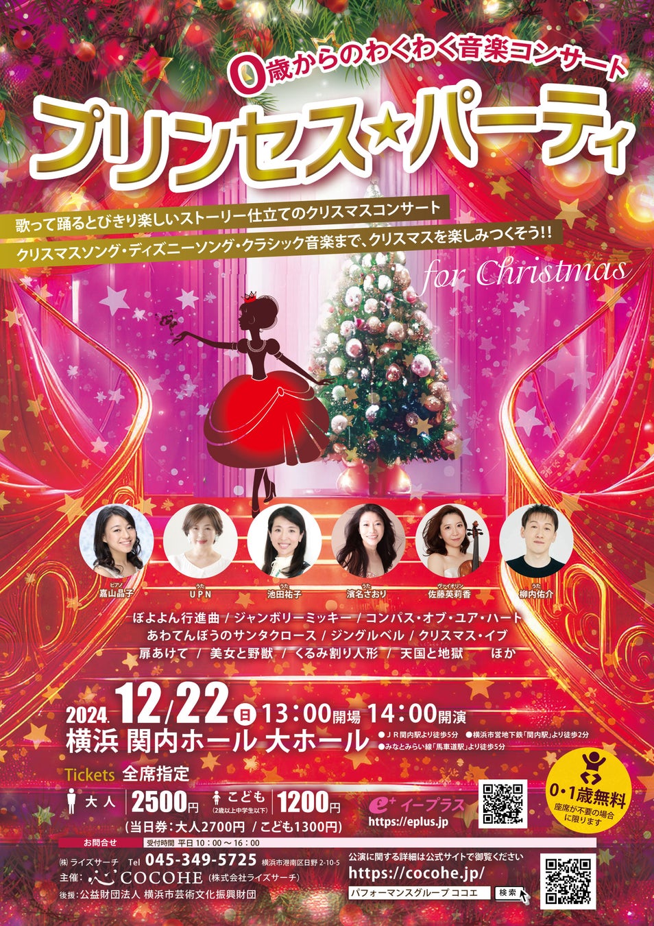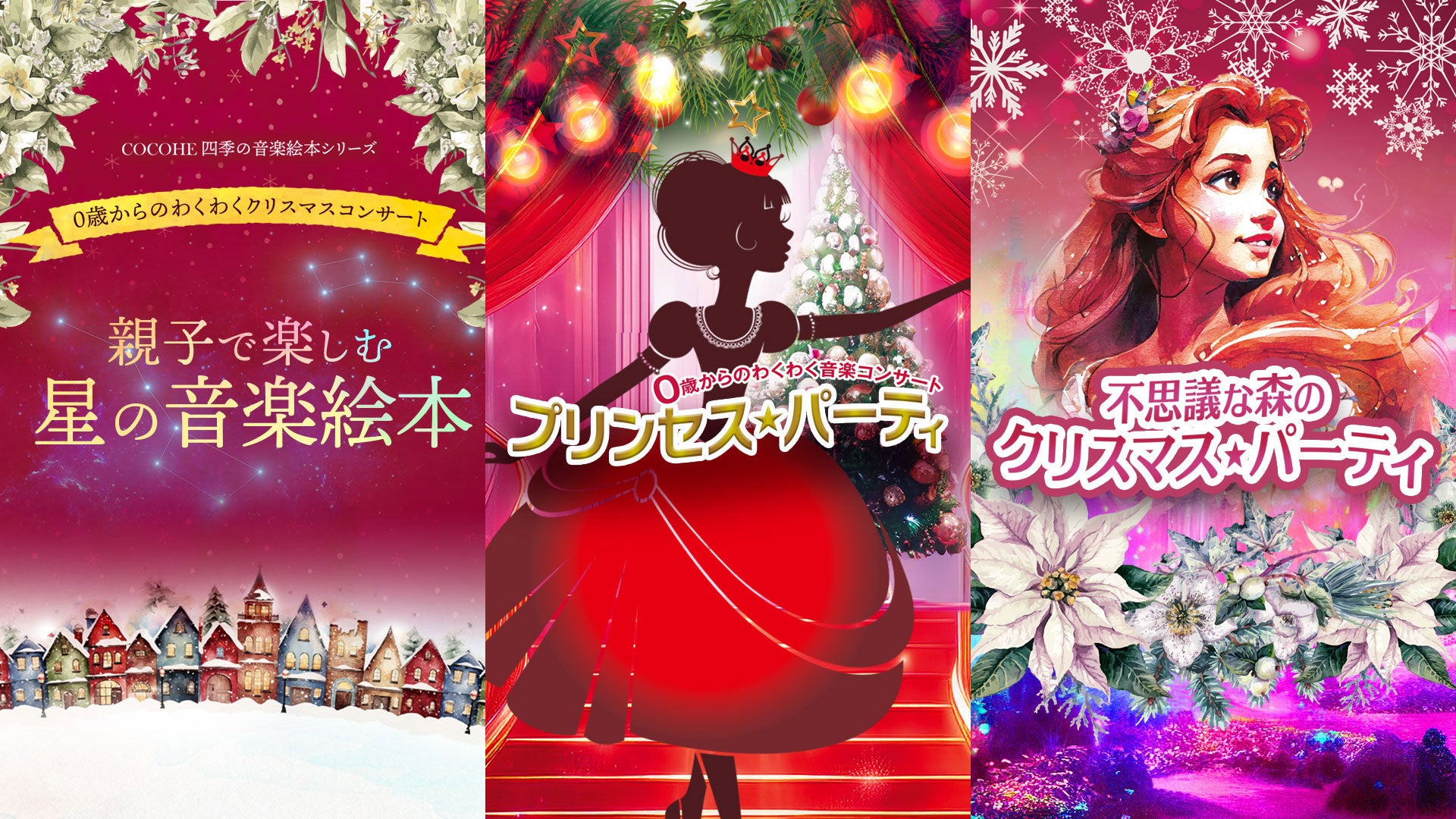 0歳からのわくわく音楽コンサート「COCOHE(ココエ)」を運営する株式会社ライズサーチ(所在地:横浜市港南区 代表取締役 内田奈津子)は、2024年12月11日(水)「不思議な森のクリスマス★パーティ」(みなとみらいホール)、12月18日(水)「親子で楽しむ星の音楽絵本」(かなっくホール)、2024年12月22日(日)「プリンセス★パーティ」(関内ホール 大ホール)を開催する。