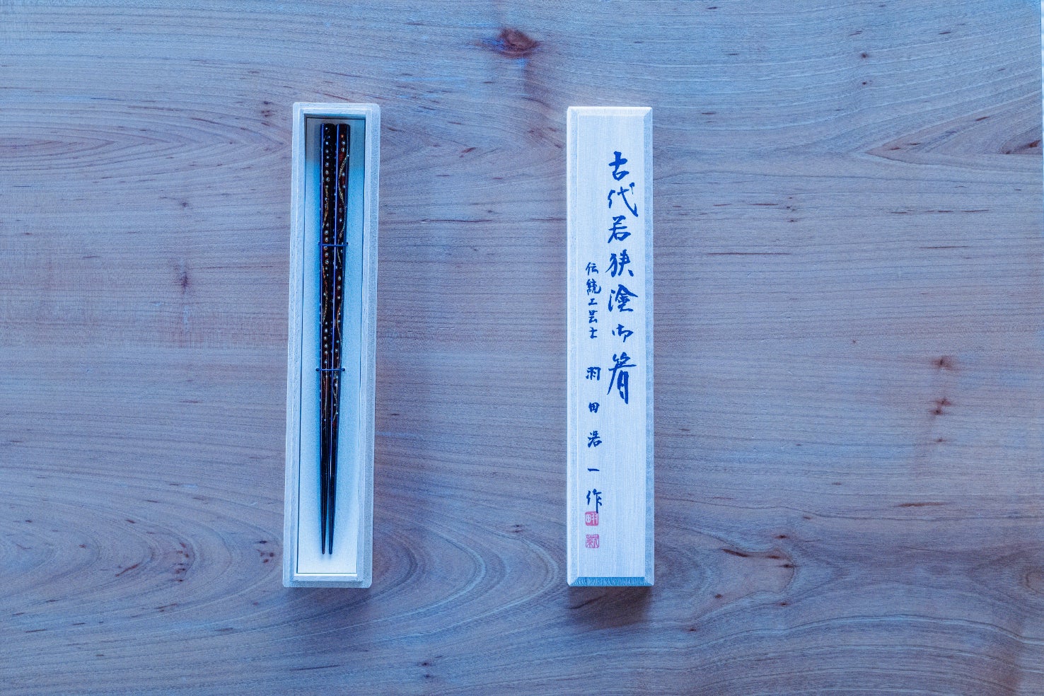 西津は日本一の箸の生産地。古くからの漁師町として栄え、京都からいちばん近い海として北前船の重要な寄港地となりました。西津のその独特の歩みが、独自の若狭塗を生み出し、現在は箸の生産地として職人たちが暮らしています。