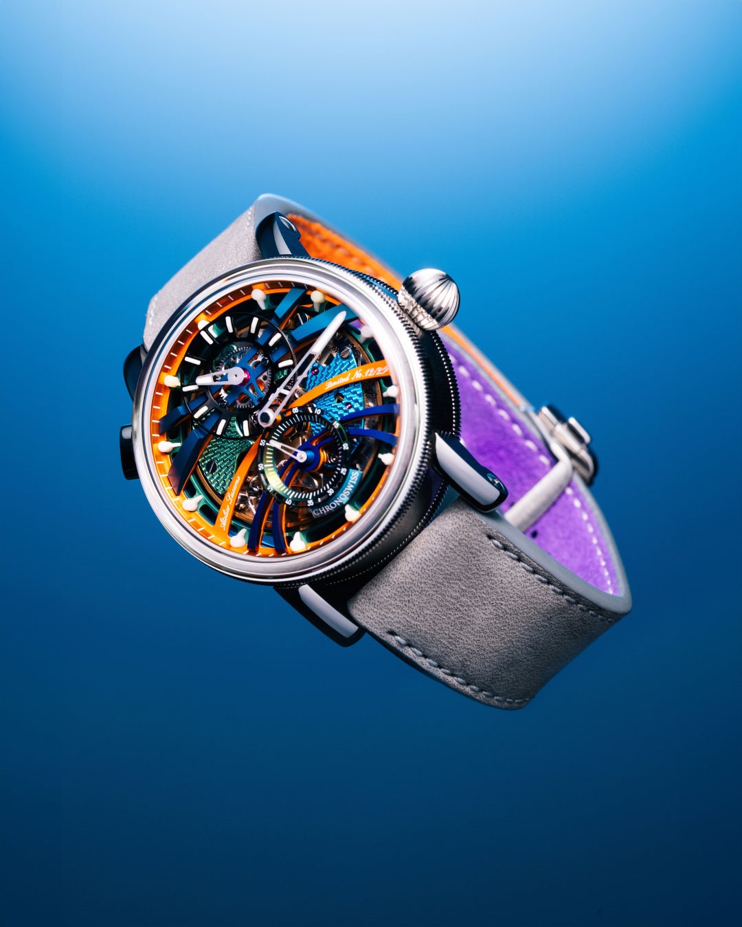 多層ダイヤルはスケルトン化されたステージであり、同時にムーブメントの一部でもあります。エレクトリックな青、オレンジ、紫のCVDコーティングされたブリッジが、パライバグリーンの分リング、浮遊する時表示、スモールセコンドリングを保持しています。1時位置では、このスペクトルの中が完全に見られます。ボタンを押すと設定された打撃ハンマーがロックコンサートのように音を解き放ちます。名前からもわかるように時計を見るだけでなく、音でも楽しめます。すべてのチャイムは革新の叫びであり、古典的なリピーターウォッチの伝統から解放されます。レガシームーブメント自体もギグ(セッション)の一部となり、スーパールミノバブロックとハンドギョーシェ彫りのブリッジを採用しています。メカニズムが作動するとブリッジの1つが動き、ダイヤルのダイナミックなエネルギーを高めます。ルツェルンの時計職人は、光るセラミックブロックを「チキンヘッド」と呼び、ロックコンサートのステージにある象徴的なアンプのノブに敬意を表しています。音量を上げ、観客(着用者)を興奮させるように設計されています。