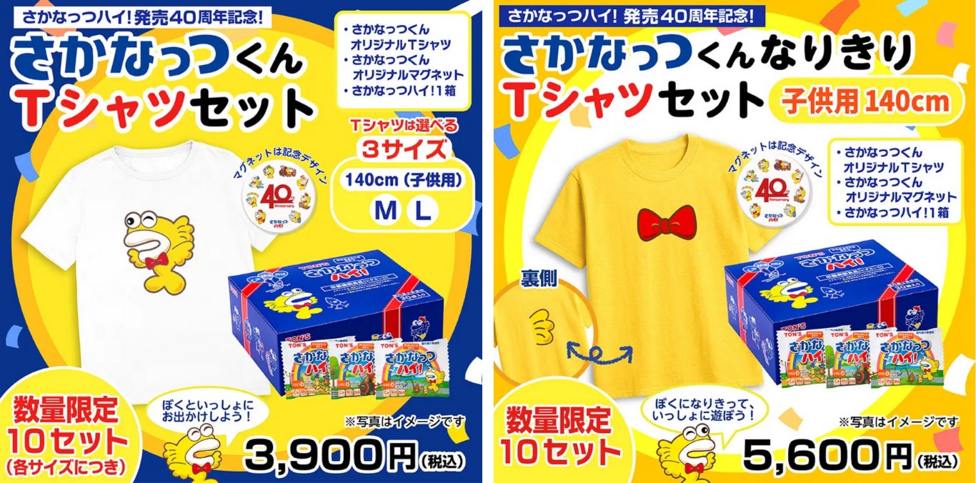 『さかなっつハイ!』1箱(30袋)+オリジナルデザインのTシャツ(1枚)+缶バッジマグネット(1個)が入った、全3種類の「40周年特別セット」をオンラインショップ「よいナッツ屋さん」にて発売中(数量限定)。