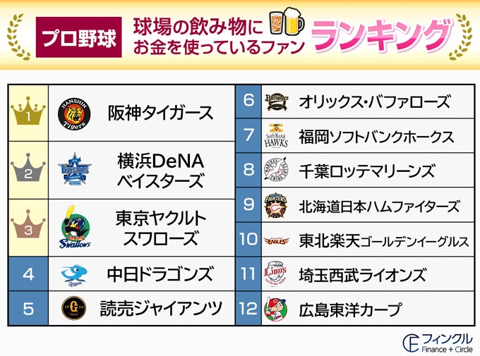 アンケートの結果、1人当たり野球観戦時に、飲み物にお金を使っている球団ファンのランキングは、以下のとおりです。