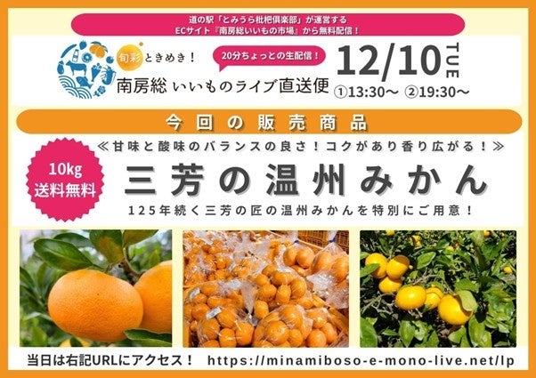 株式会社マインドシェア(東京都、代表取締役社長:今井祥雅)は、デジタルでつながる南房総里山感動宅急便推進協議会(千葉県、会長:鈴木賢二)と実施する、特産品を紹介するライブコマースプロジェクト「旬彩ときめき!南房総いいものライブ直送便」の第7弾を12月10日(火)に配信します。