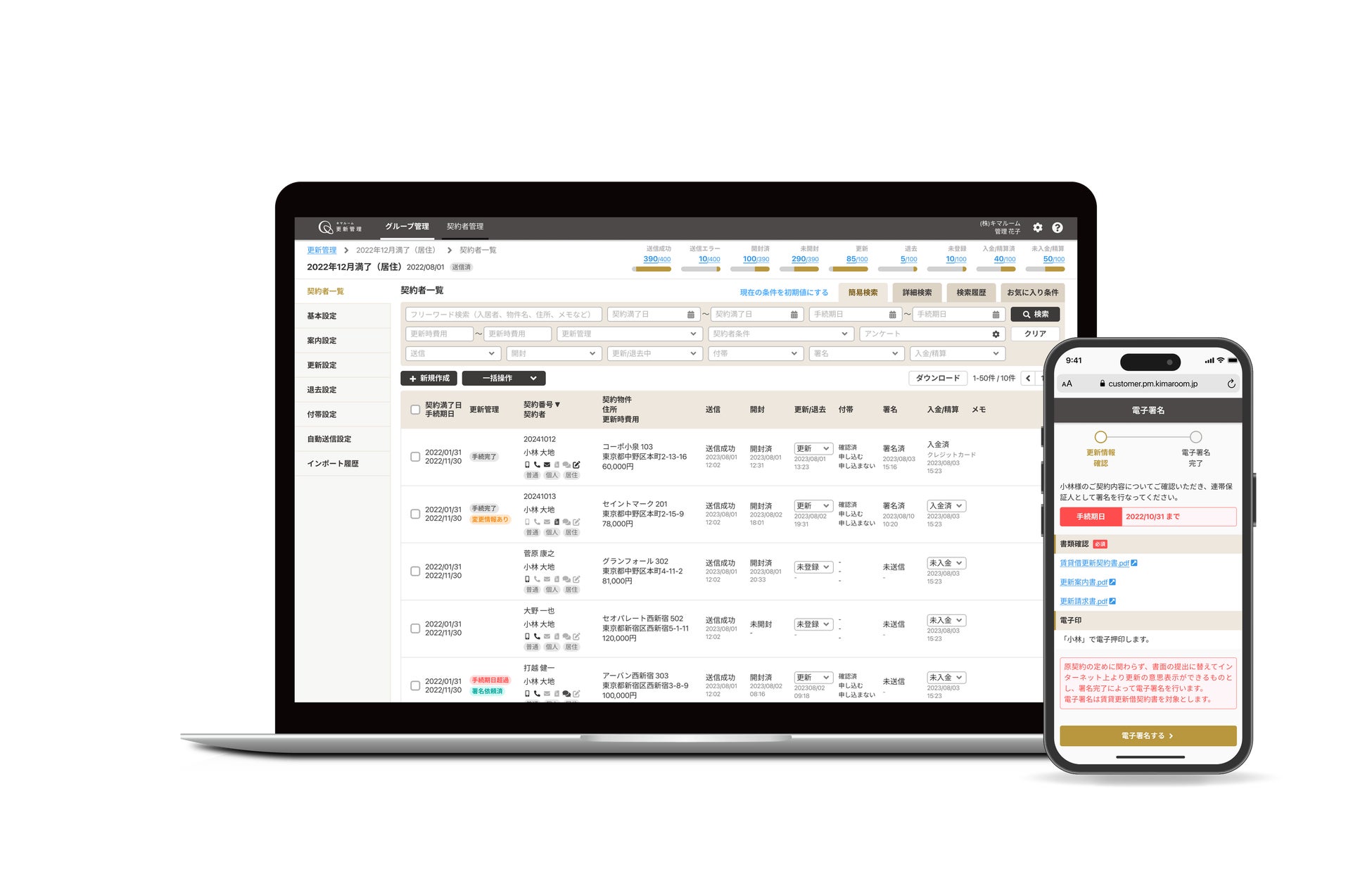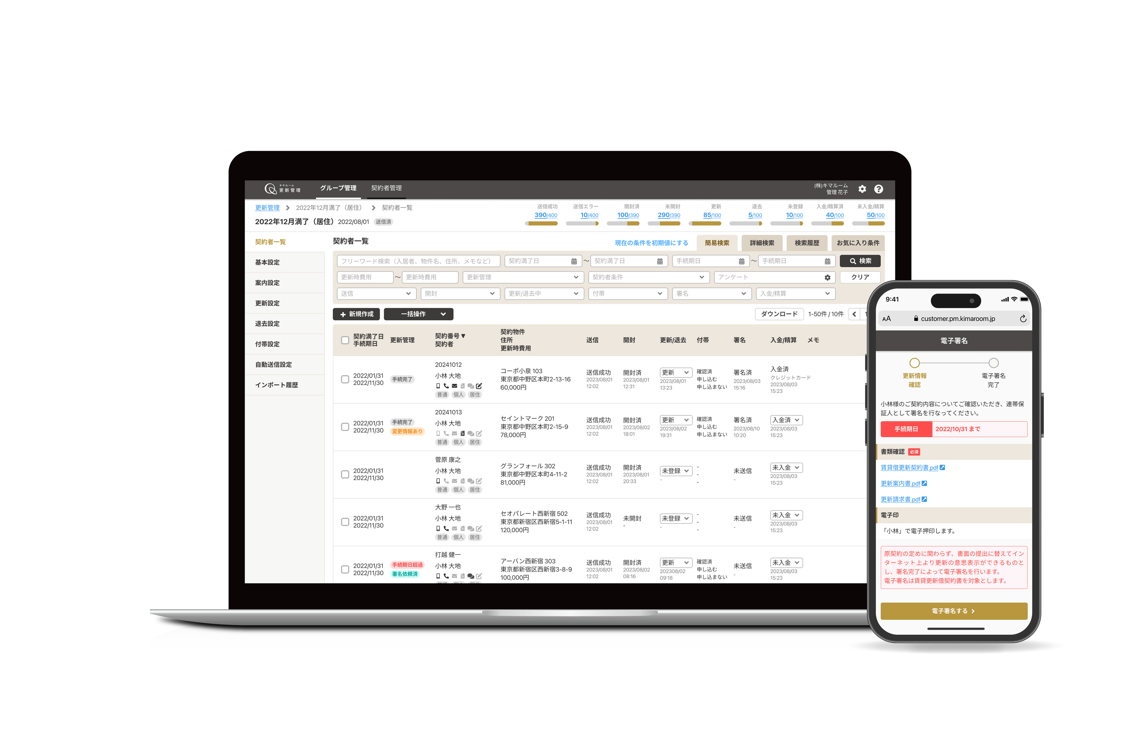 当社が 2022年11月にリリースした、賃貸の更新管理業務に特化した DX ツールです。2025年 10月28日、名称を「キマルーム PM」から「キマルーム 更新管理」に変更しました。(※3)更新のご案内をメールや SMS で一斉送信・契約書類の自動生成や電子契約・更新料の電子決済(※4)が可能で郵送費などの費用削減、人的コストの削減を実現します。