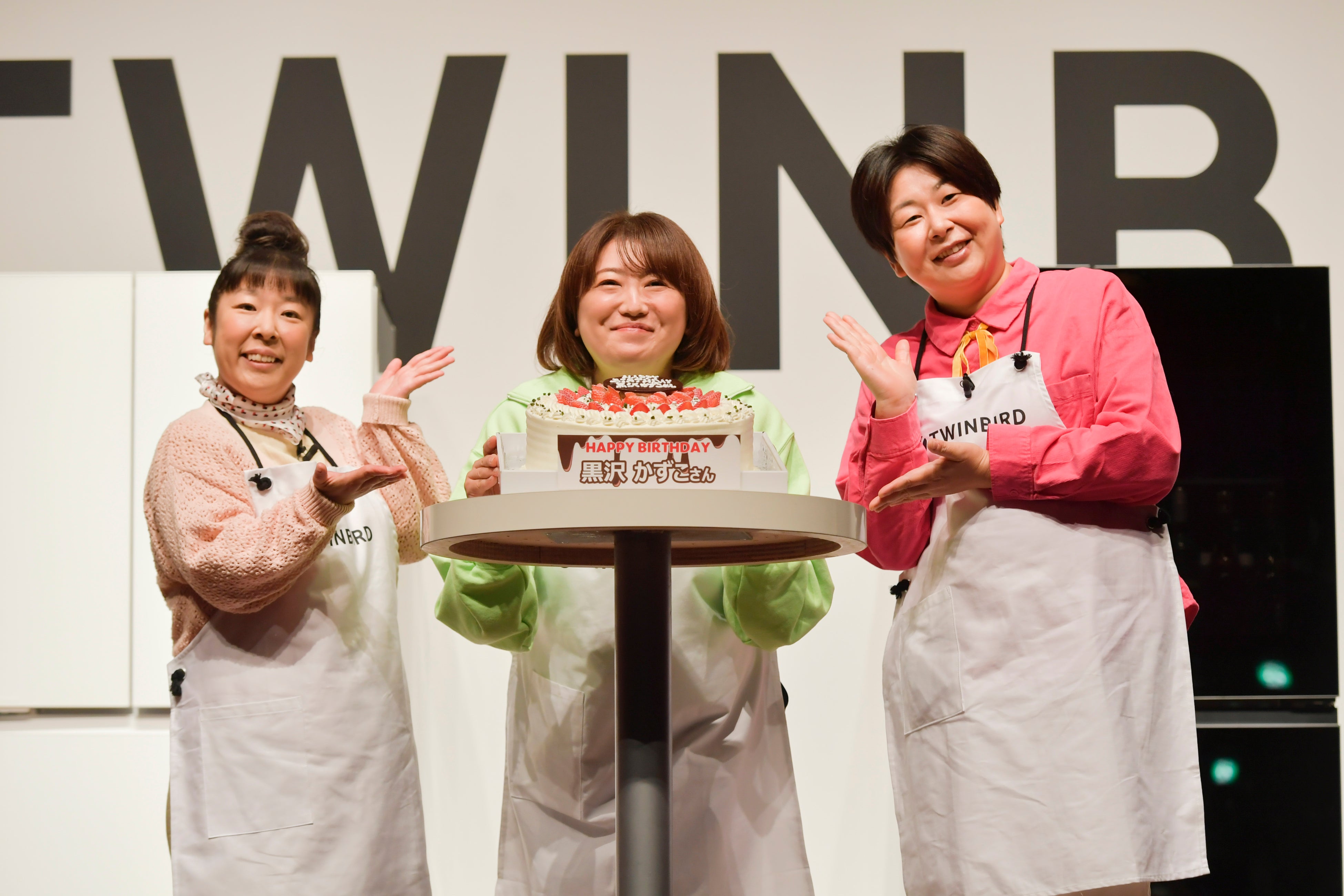 会の終盤では先日誕生日を迎えられた黒沢さんに、森三中のお2人からサプライズケーキをプレゼントするシーンも。「中身が見える冷蔵庫」のミラーガラスが透け、冷蔵庫の中身がクリアになると「お誕生日おめでとう」と書かれたケーキが登場しました。村上さんは「高さはおさえられているのに、こんなに大きなケーキもちゃんと入るんですね!」と誕生日ケーキを取り出した感想をコメント。サプライズケーキを前にしばらく驚いた顔のままだった黒沢さんは、会場の拍手とともに、「え~!ありがとうございます、、!」と何度もお辞儀をし、「これからも頑張りますので、こんな私を見守っていただけると嬉しいです。今までを振り返って、この2人に出会えたことが嬉しいですし、この冷蔵庫にも出会えてよかったです!このケーキも準備していただいて本当にありがとうございます!」と喜びを表現していました。