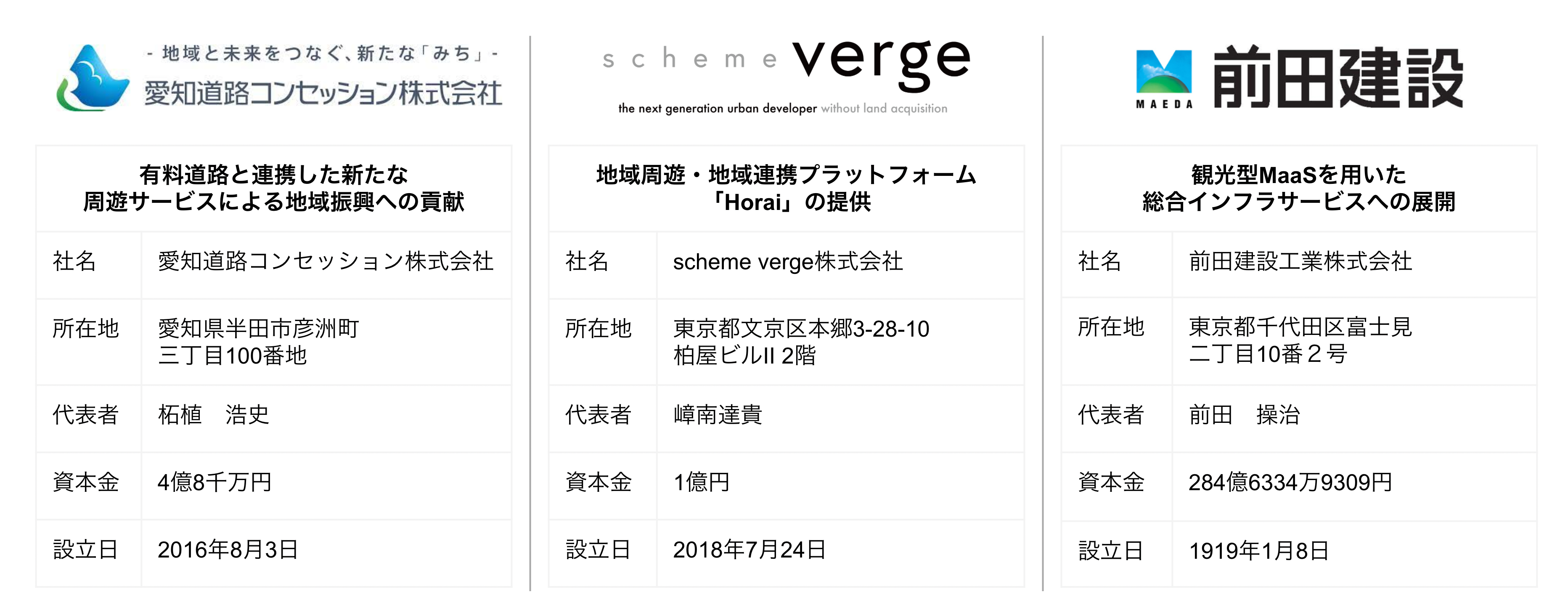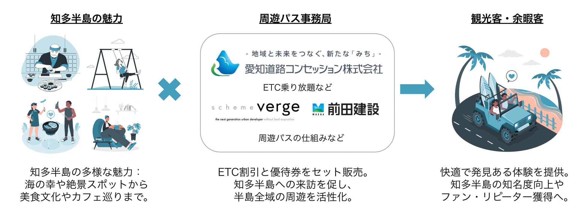 本取り組みは、愛知道路コンセッション株式会社・scheme verge株式会社・前田建設工業株式会社の三社が協力し「観光型MaaS」を構築。知多半島の周遊を活性化すると同時に、地域一体となった盛り上げ施策を推進・加速してまいります。