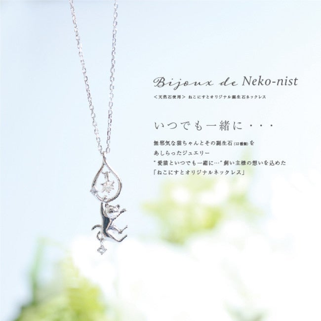 誕生石(全12種類)をあしらったジュエリーで、素材は、シルバーと天然石を使用。完全オリジナルデザインで、「ねこにすと」での限定販売です。無邪気な猫ちゃんデザインジュエリーと、ご自身の愛猫ちゃんの誕生石を身につけられるラグジュアリーネックレスに仕上げました。また、ゴールド、プラチナと素材を変えたさらにハイグレードな商品も販売予定です。